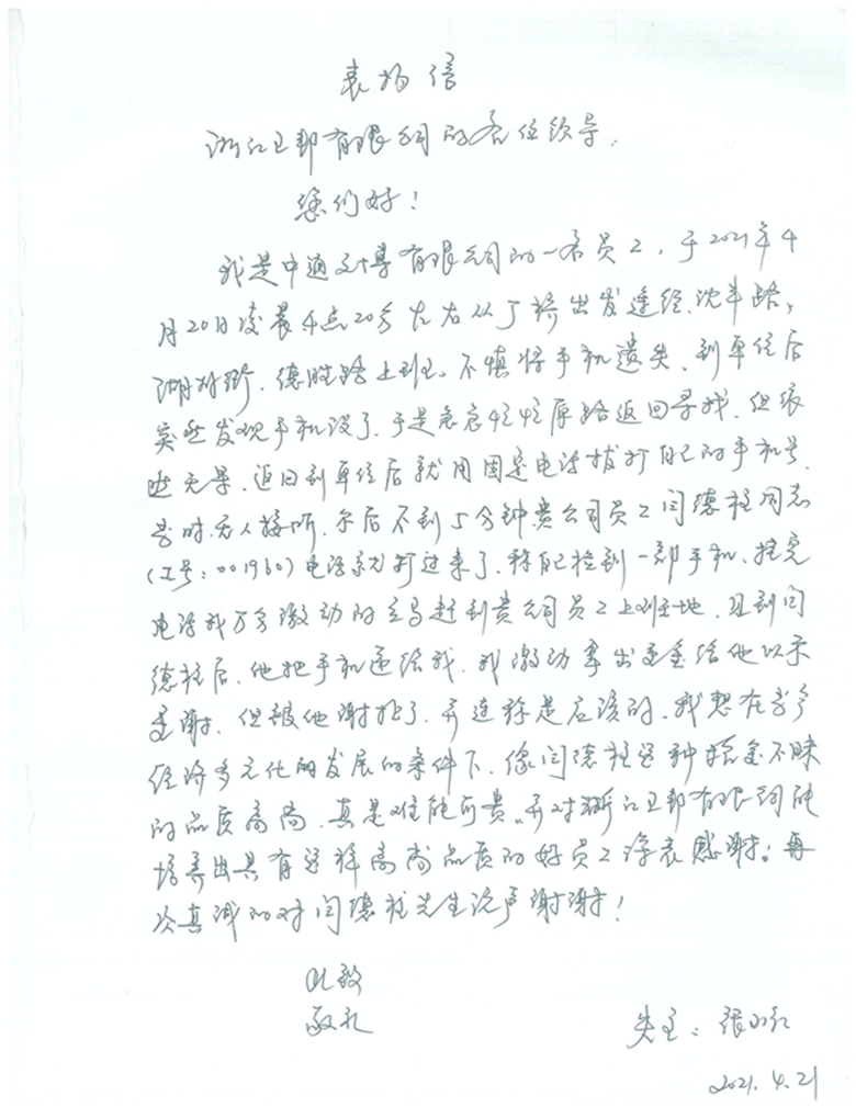 近日,浙江卫邦保安公司收到一封张女士的表扬信,对保安员闫德柱拾金不昧的高尚品质给予点赞并致以感谢!