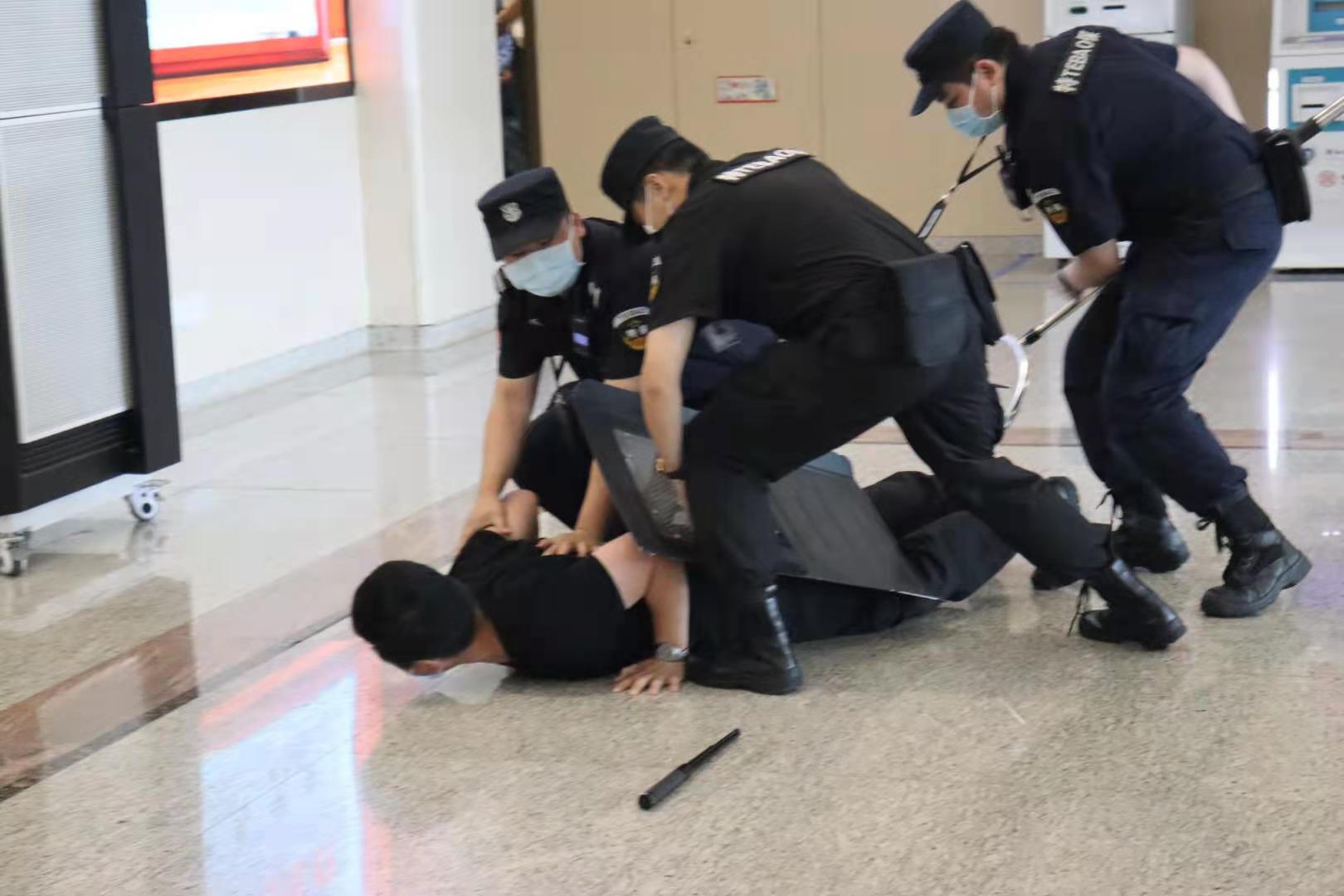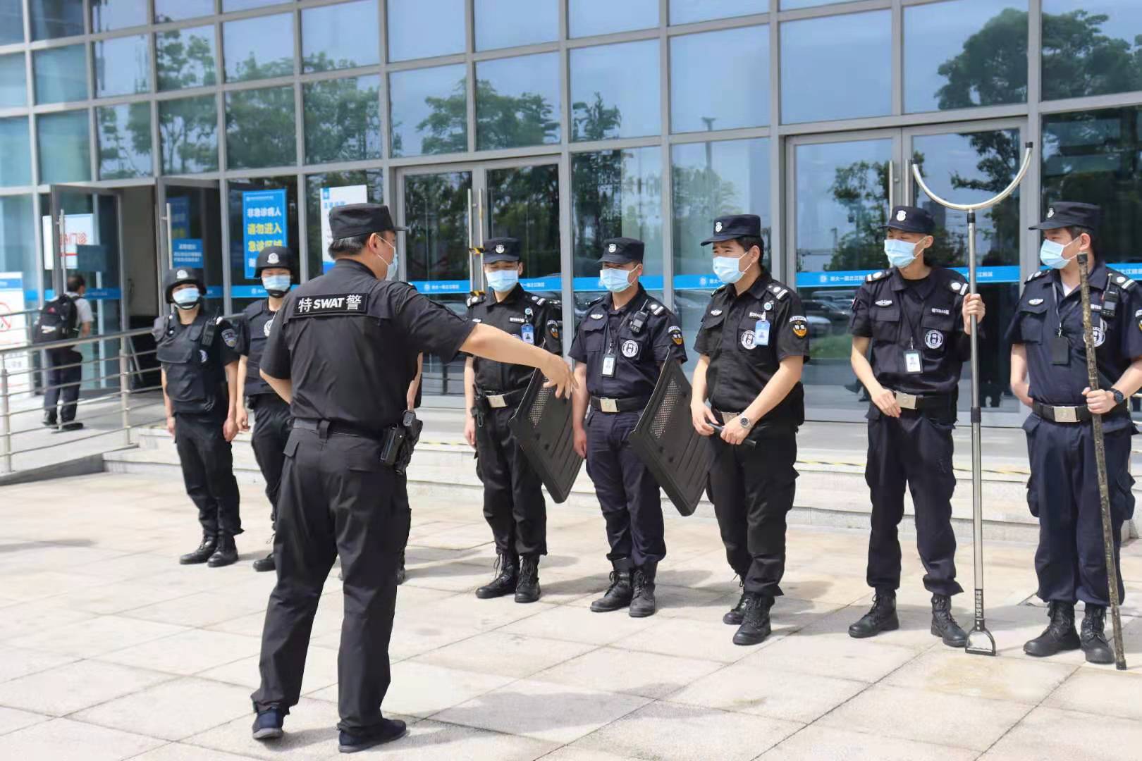 为进一步加强驻点医院反恐防暴处置能力,快速有效打击暴力袭击违法行为,保护医护人员和广大患者生命财产安全,2021年5月27日上午,浙江杭泰驻浙大一院之江院区保安队特邀请西湖特勤大队胡教官、驻点民警沈警官现场指导医闹反恐实战演练,公司高总、项目经理李志飞以及特保10名应急小分队人员参加了此次培训及演练。