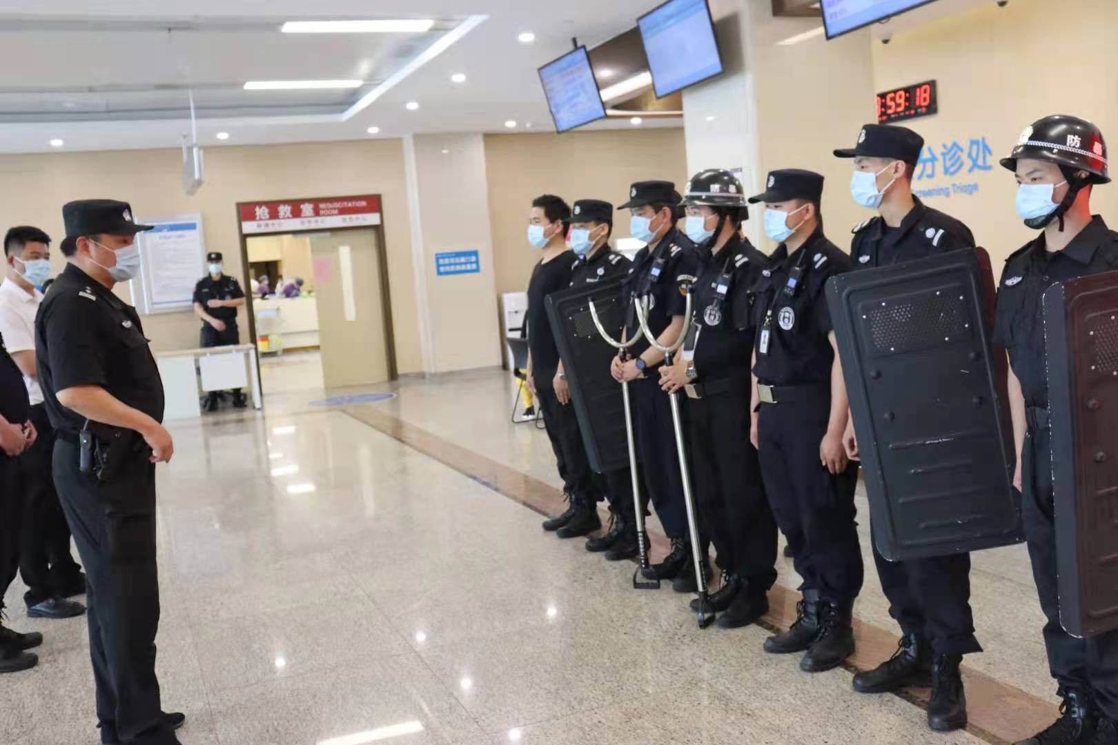 随后,保卫部与急诊部结合医院特点和实际情况,驻点特战应急分队成功实施了“盾牌基础动作”、“对医闹、酗酒滋事人员的处置”、“防冲撞设施应用”、“应对刀斧砍杀的处置”等科目的演练。演练过程中,身着钢盔、防刺服的应急小分队队员按照演练流程,各司其职、协作配合,运用盾牌、钢叉等反恐器材,快速有效地制服暴恐分子,实战技能得到锻炼和提高。