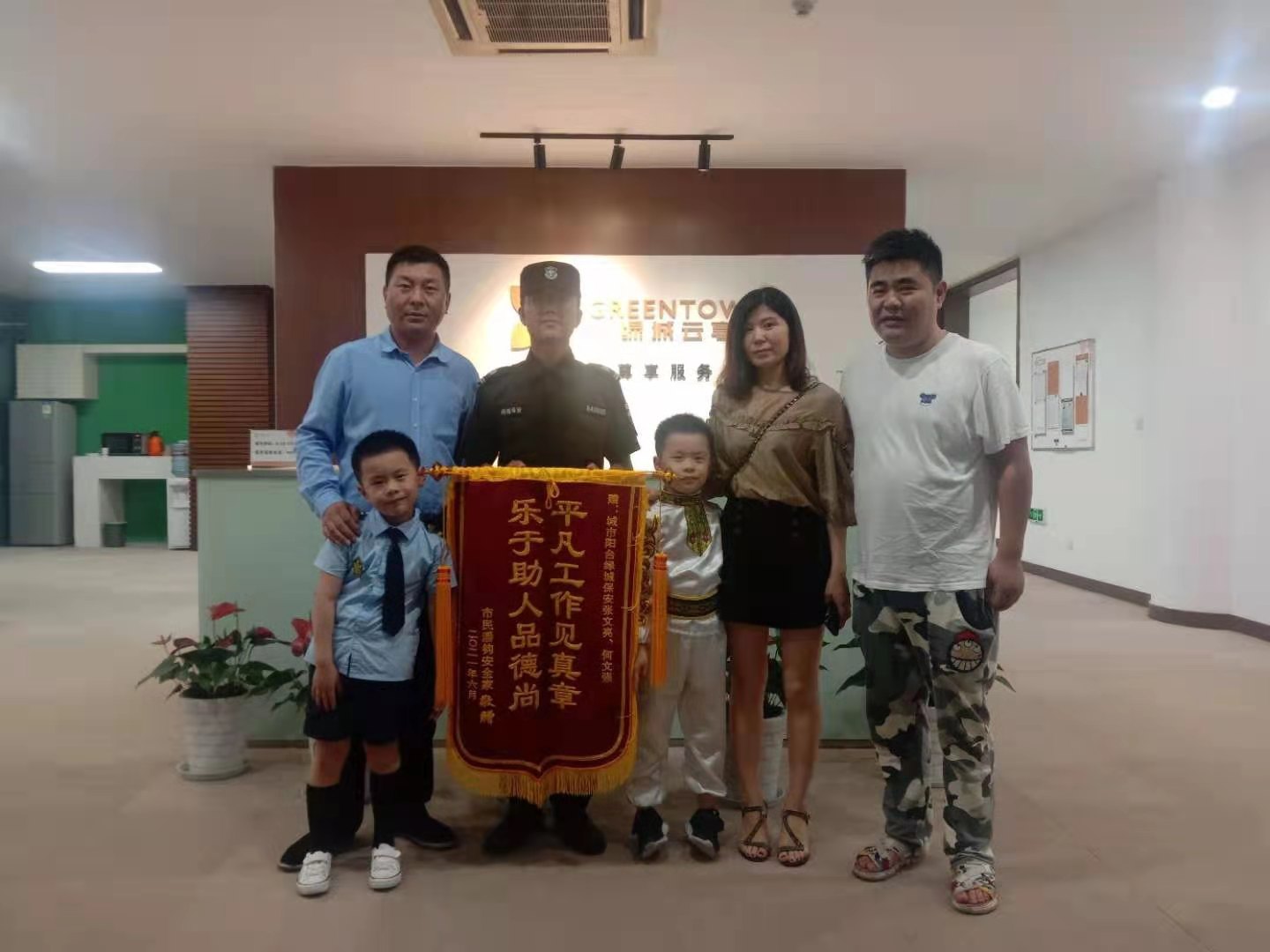 6月8日晚19点左右,孩子父母一家人携带一面写有“平凡工作见真情,乐于助人品德尚”的锦旗,送到城市阳台保安队,感谢保安张文亮、何文强两位队员,对绿城保安履职尽责的工作态度和无私奉献的精神给予高度肯定。