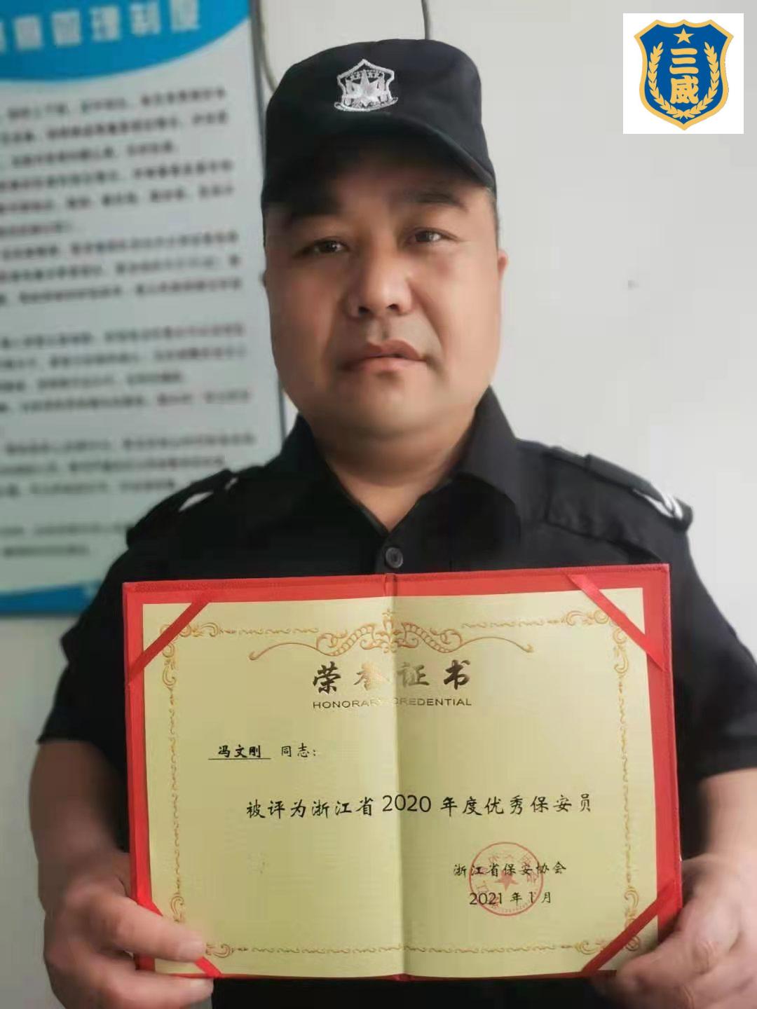 【三威保安】我公司保安员冯文刚被评为2020年度浙江省优秀保安员