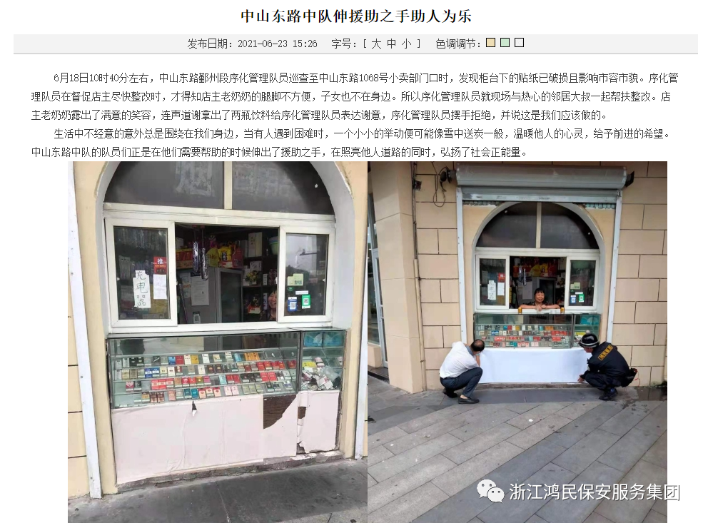 浙江鸿民保安集团城市序化管理综合治理服务,自从服务宁波中山东路辖区以来,城市序化管理工作一直收获辖区群众的大拇指点赞,面对荣誉和肯定,鸿民保安城市序化队员们只是很谦虚地说:“这是我们应该做的。有我们在岗一天,就要为辖区的群众们服务到每一个细节。用热心爱心真心和耐心,在城市序化管理岗位上发光发热。”
