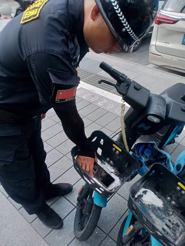 2021年6月25日星期五,宁波中山东路1180号门前人行道,鸿民保安集团城市序化队员例行进行每日市容市貌巡查,序化员在整理路边随意停放的共享单车时,意外发现在单车车篮里还遗留着不知道哪位群众落下的手机,手机设有屏保开机密码,鸿民保安队员将一时无法联络失主,在宁波的烈日下苦等半小时无果,就将失物带回城市综合序化管理服务岗,将手机保持开机状态,静候失主或者失主的亲朋好友打进电话来。