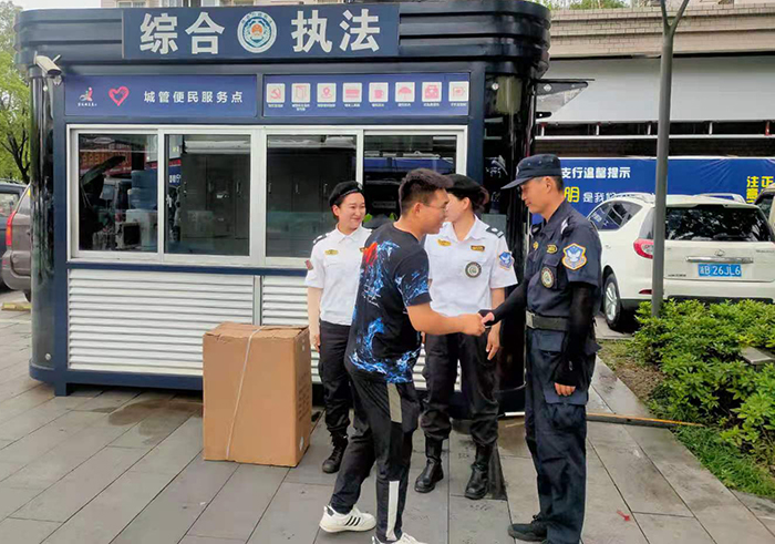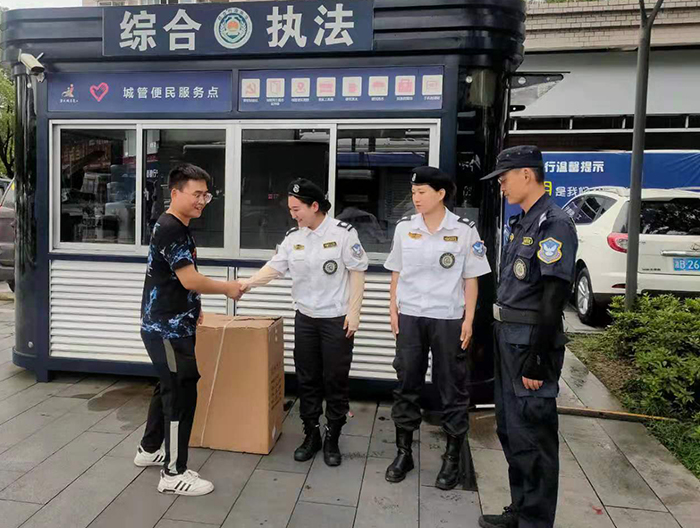 经询问,失主是送货太着急把一箱塑身机给遗忘路边了,一箱货值价值8千多。失主特别感谢城管序化队员帮忙将货品完好无损无缺地保管收藏好。