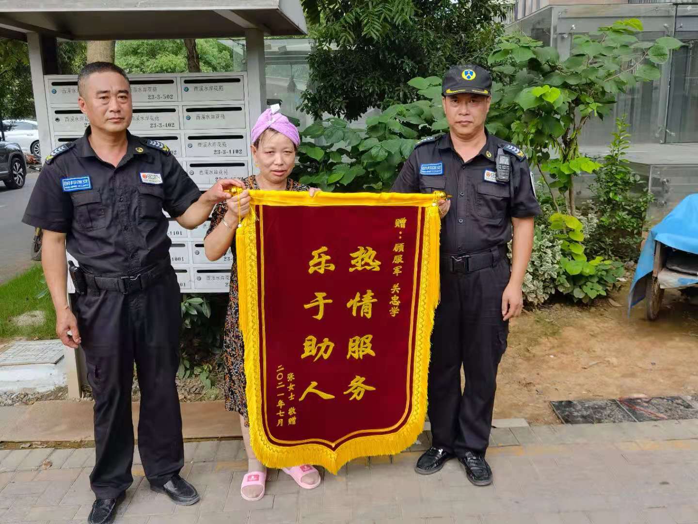 7月5日上午,一位女士将一面写有“热情服务,乐于助人”的锦旗送到明邦保安西溪水岸项目部。那么这对女士为何要给保安送锦旗呢,事还要从6月23日说起...