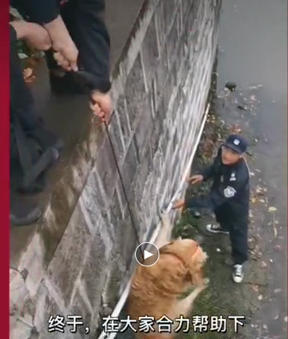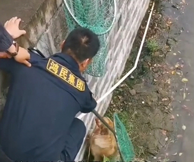 鸿民保安见状赶紧拿来网兜绳索等救援工具,企图把离岸3米多高的“毛孩子”救起。网兜太短,够也够不着,打捞无果后,鸿民保安队员利用部队里学到的攀爬技能,快速下到河岸滩涂上,岸上队员齐心协力往上提,终于成功地把“毛孩子”吊上来。
