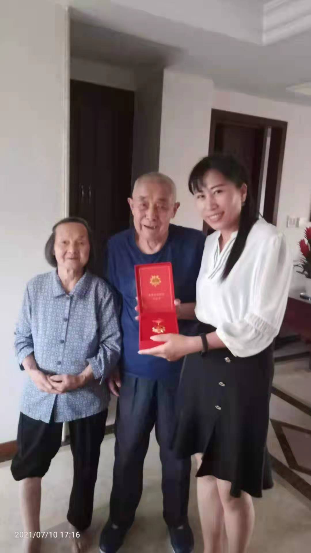 按过门铃后片刻,开门的是大爷,看到了霍燚,既惊喜又高兴,赶紧去喊老伴:“快出来快出来你看谁来了”,阿姨颤巍巍的挪动脚步走出来,来到门口先是愣了片刻,瞬间又像个孩子似的开心到手舞足蹈,赶忙拽着霍燚让到屋里坐下,俩人相互问候着,大娘抱住霍燚,不肯撒手,激动的热泪盈眶,像是许久没见面的母女一般,在和两位老人聊天中,得知大爷原来竟是具有65年党龄的老党员,他还当即把珍藏几十年的徽章拿给霍燚看,这次更有共同语言了,作为党员的霍燚说她父亲也有60年党龄了,说到激动之处,二人起身握拳,一起背诵入党誓词……