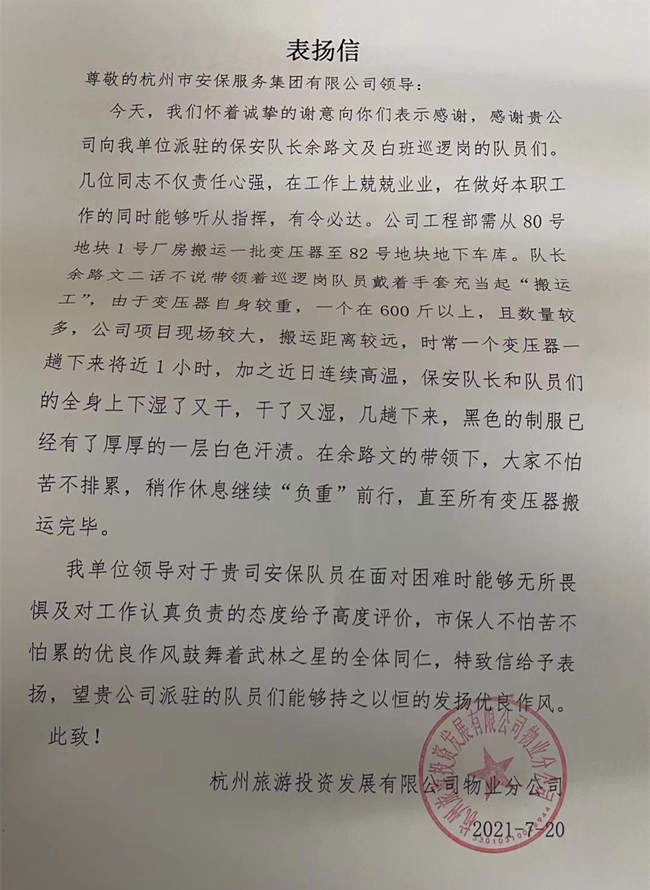 近日杭州市安保集团收到了一份来自客户单位的表扬信,信中对公司派驻保安队员不怕辛苦,热情服务的精神表示感谢与赞扬。