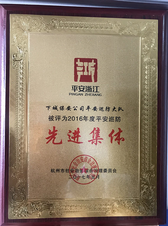 杭州市下城保安服务公司平安巡防大队被杭州市社会治安综合治理委员会评为“2016年度平安巡防先进集体”,并颁发了奖牌,以资鼓励。