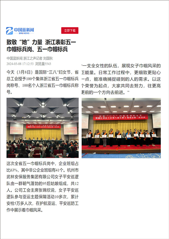 昨天,武林安保集团平安巡逻队荣获“浙江省五一巾帼标兵岗”荣誉称,各级媒体追踪报道武林安保女子平安巡逻队,成为节日里一道靓丽的风景。