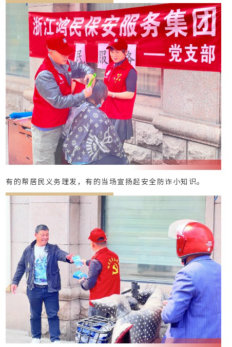 这一天,浙江鸿民保安服务集团党支部的党员同志们,和集团团支部成员们,以及鸿民保安入党积极分子,大家放下手头的工作,身着统一的志愿者服装,带着满满的热情和责任心,齐聚在一起,开展了一次意义深远的学雷锋为民服务主题活动。此刻的鸿民保安队员们,纷纷亮明斜杠青年的身份,有的帮群众维修小家电,有的帮居民义务理发,有的当场宣扬起安全防诈小知识。