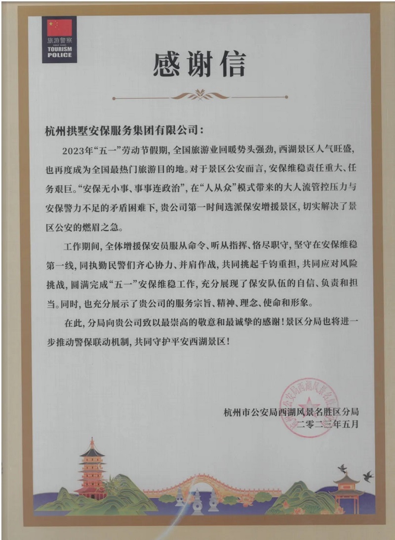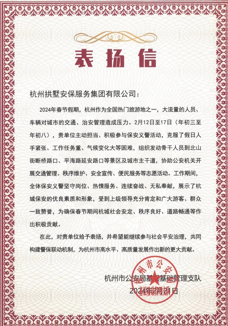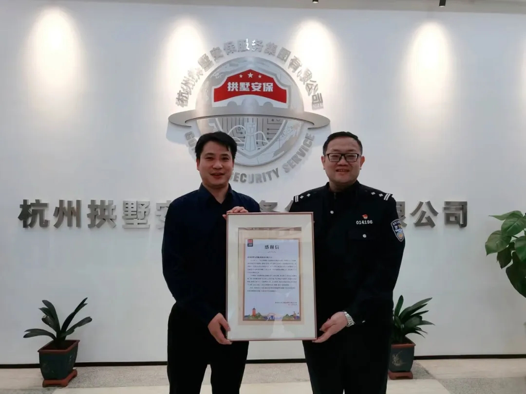 同时,公司还收到了来自公安机关的感谢信和表扬信。信中,充分肯定了拱墅安保集团大力配合公安机关构建警保联动机制作出的贡献,同时,对公司队员在参加保安义警志愿服务、参与社会平安治理等工作中的辛勤付出表示了感谢。