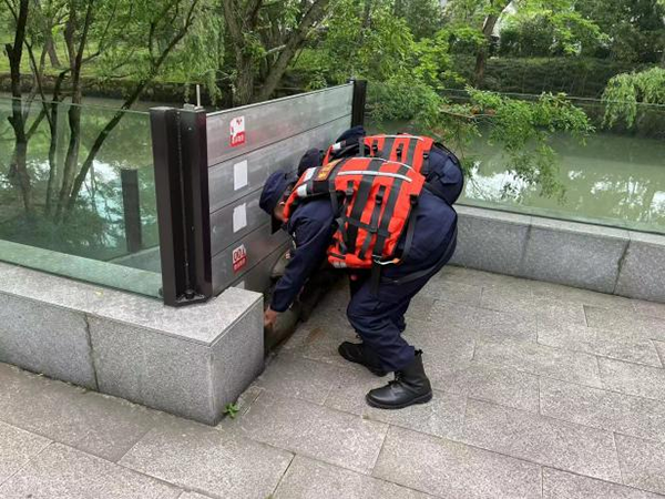 此次演练,以持续特大暴雨造成溪水暴涨、江水倒灌为背景,启动应急响应后,浙江盛安驻钱江管理处特保队员第一时间集结完毕,各小组分工协作,在九溪云栖片区河道口安装防汛挡板、堆砌沙袋,避免水位上涨造成倒灌现象,并落实定岗值守、机动巡查,检验应急物资储备和应急设备使用情况,以及对防汛设施的检查和维护工作。