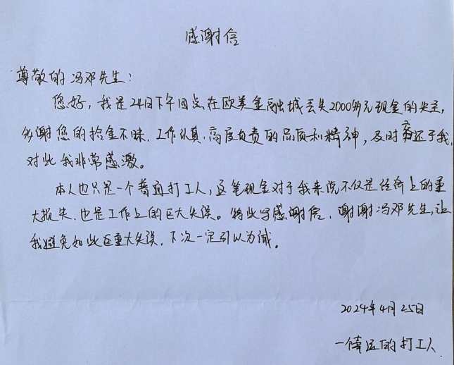 失而复得,失主姚女士非常激动开心,在返程途中,还致电对安保队员冯邓拾金不昧的精神予以高度肯定及表扬,次日,姚女士还特意手写一封感谢信,以此来表达衷心的感谢!