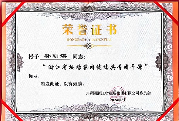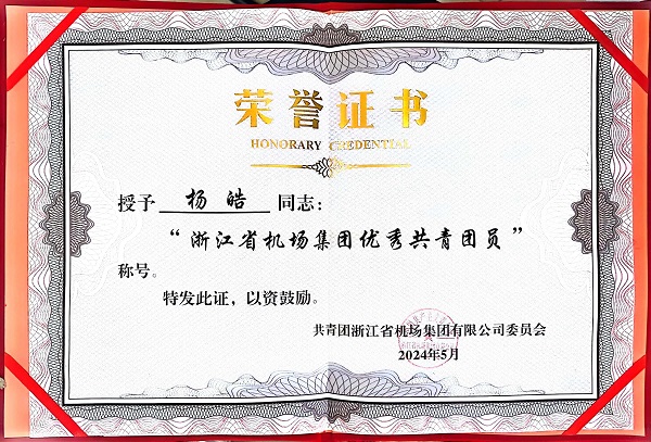 公司团总支副书记邬玥淇在团总支工作中积极作为,勇于担当,为公司团青工作注入了新鲜活力和动力,荣获“浙江省机场集团共青团干部”称号。