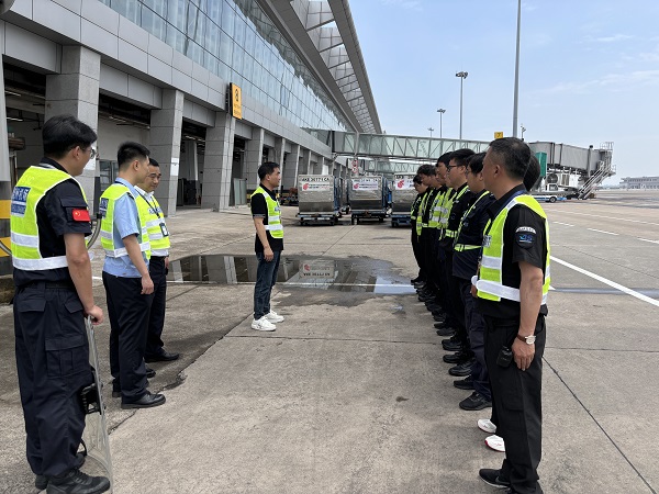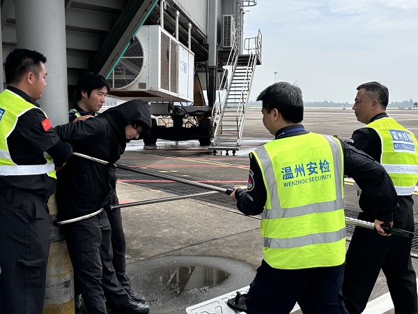 演练场景设置为航空器看护巡逻岗位队员发现一名无关人员靠近客机坪停场航空器,并无视安全警告,持续强行接近。为确保演练顺利开展,温州分公司于演练前期开展了专项预案培训。