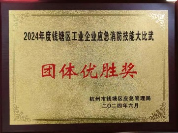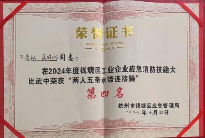 2024年7月4日,由杭州市钱塘区应急管理局组织的2024年度钱塘区工业企业应急消防技能大比武中,我司保安李也、石海彤、孟晓帆、谷振华代表甲方单位参赛。在25支参塞队伍中脱颖而出,荣获"团队优胜奖”。其中,石海彤、孟晓帆更是获得“两人五带水带连接操”第四名。