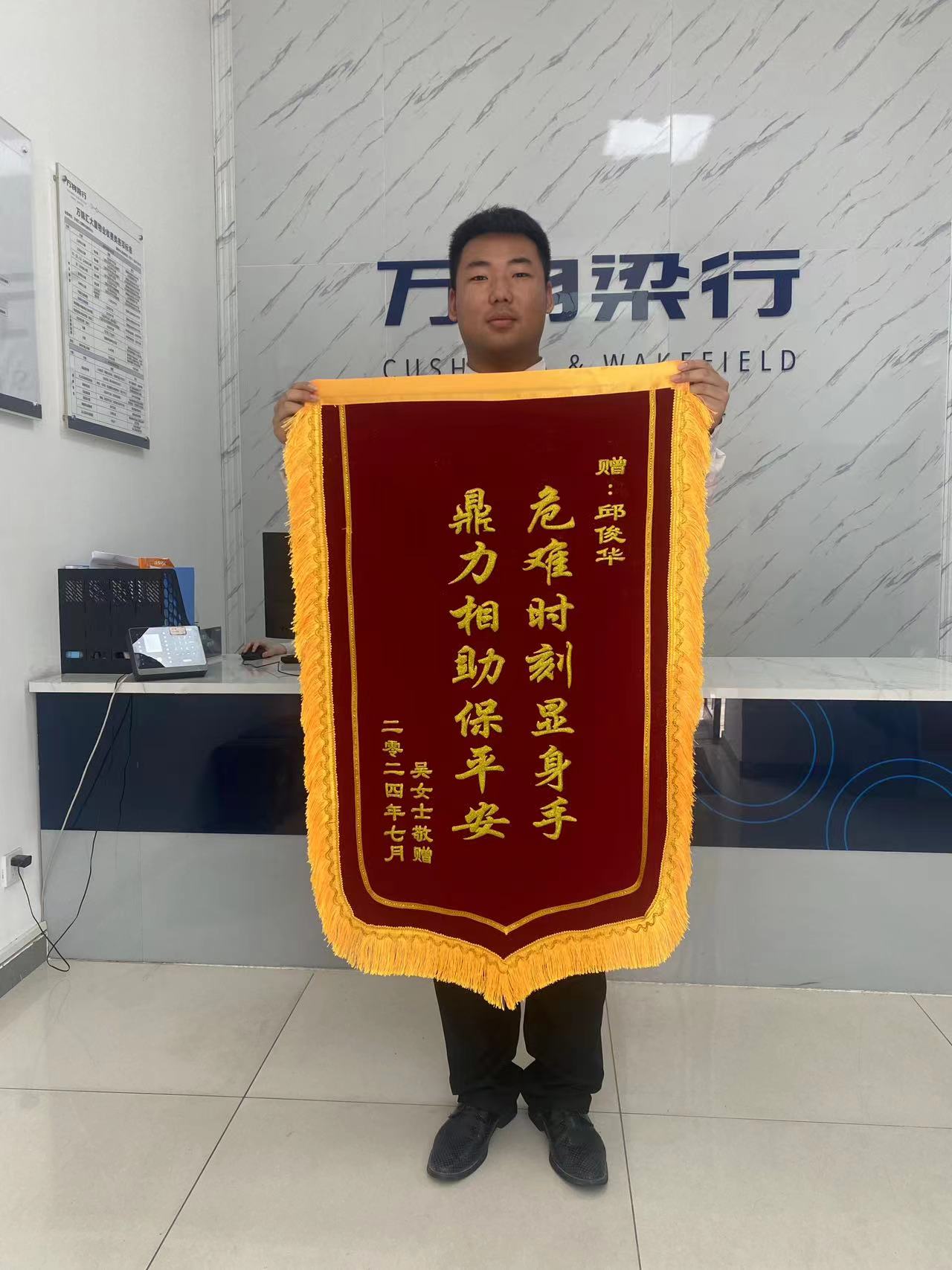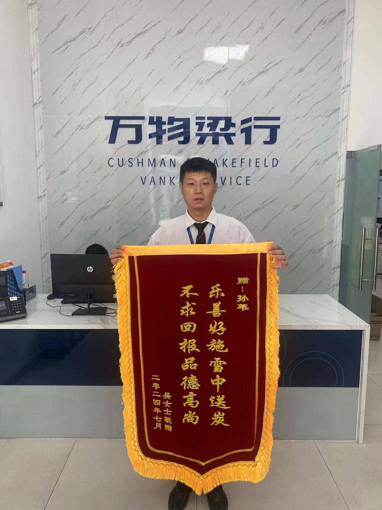 2024年7月2日吴女士因意外脚踝受伤,加上近期的暴雨天气,上下班骑车非常不放便,浙江蓝剑驻万科项目保安邱建华及孙苇两人于执勤期间,看到吴女士的这种情况,立马主动给予行动不便的吴女士撑伞、停放电动车、搀扶等帮助行为,受到帮助的吴女士表示万分感激并赠予了锦旗。