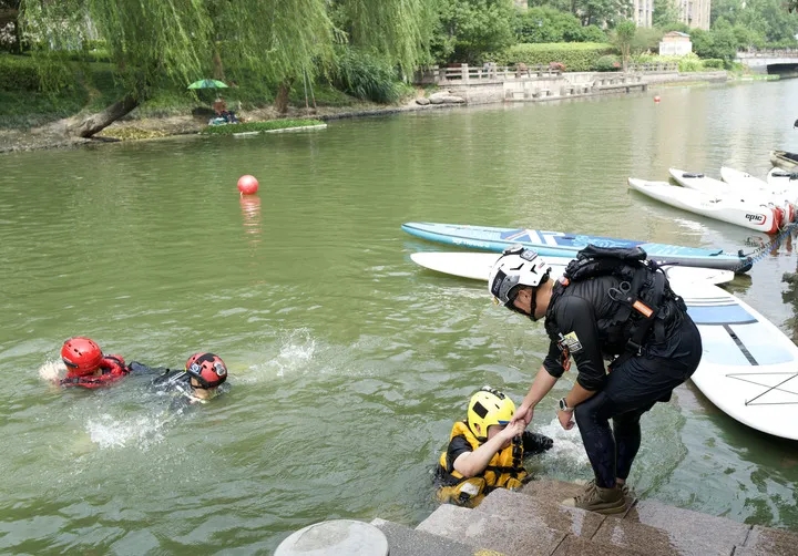 “在救援的过程中,我们首先要保证自己的安全,一定要安全规范使用牵引绳……”“公羊会”专业指导老师在西塘河边手把手教共治队员如何跳水、如何和岸上人员配合援救溺水者。随后,共治队员分组下水,通过实操训练,掌握救生橡皮艇驾驶、救生抛投器使用以及水上救援等基本技能。