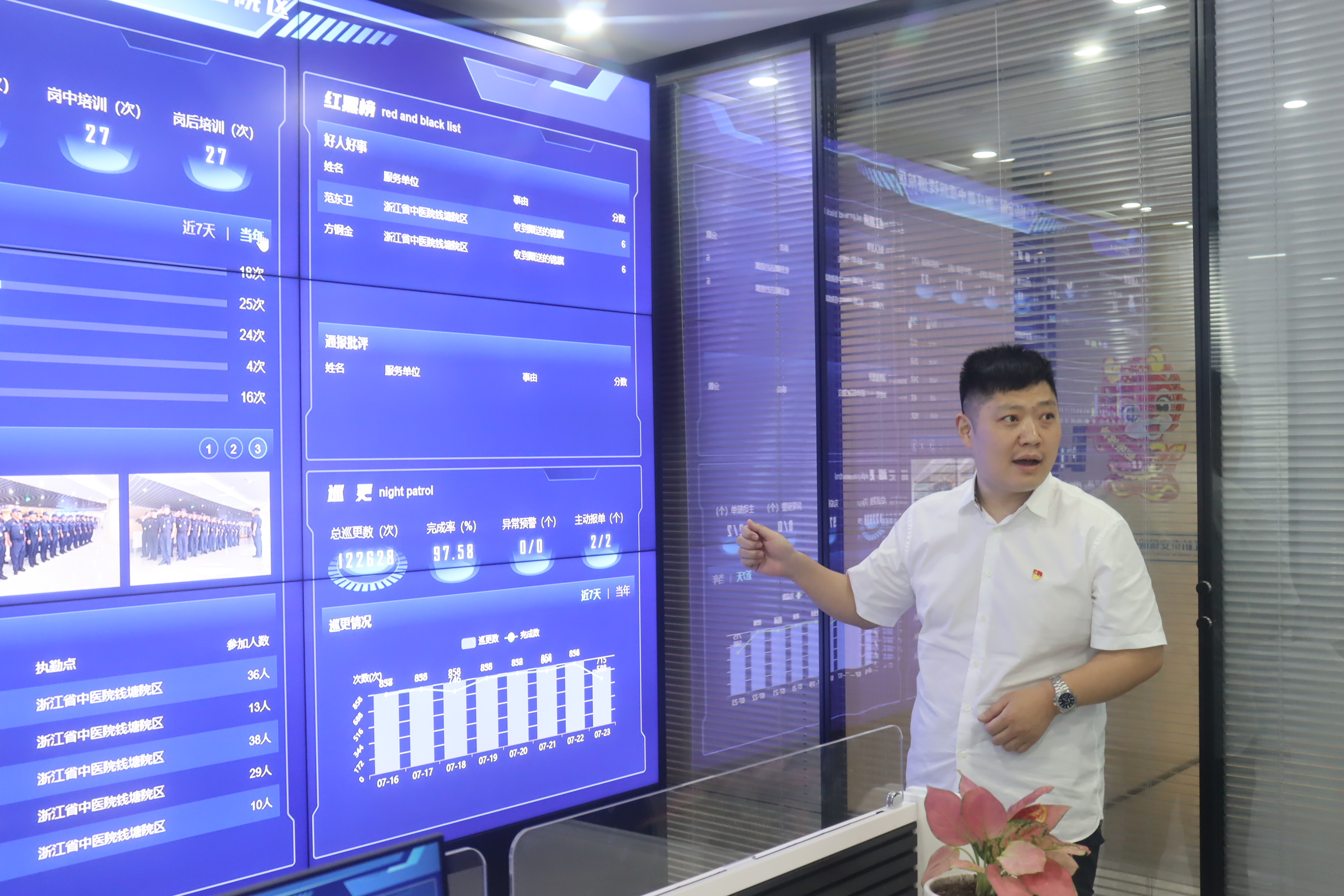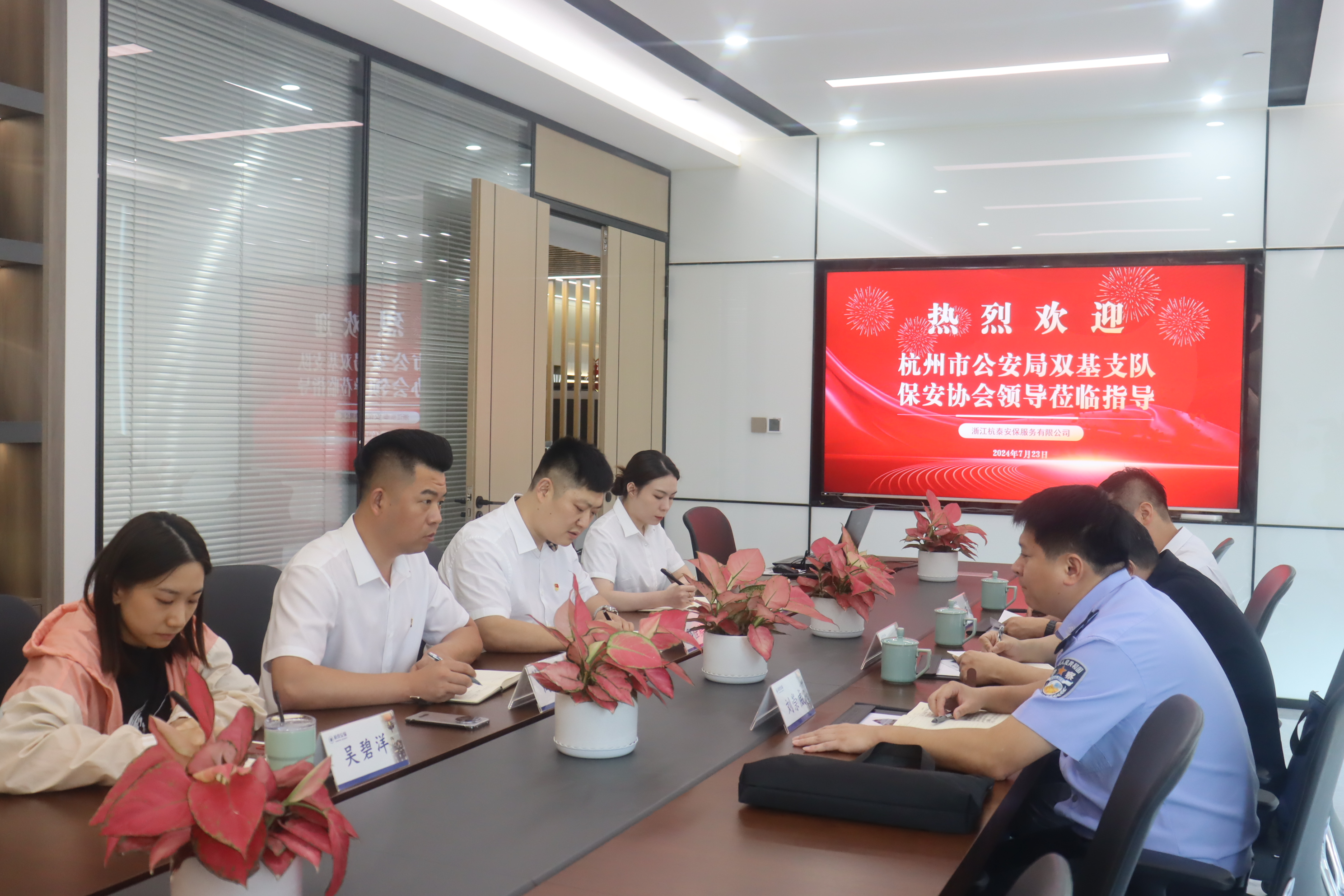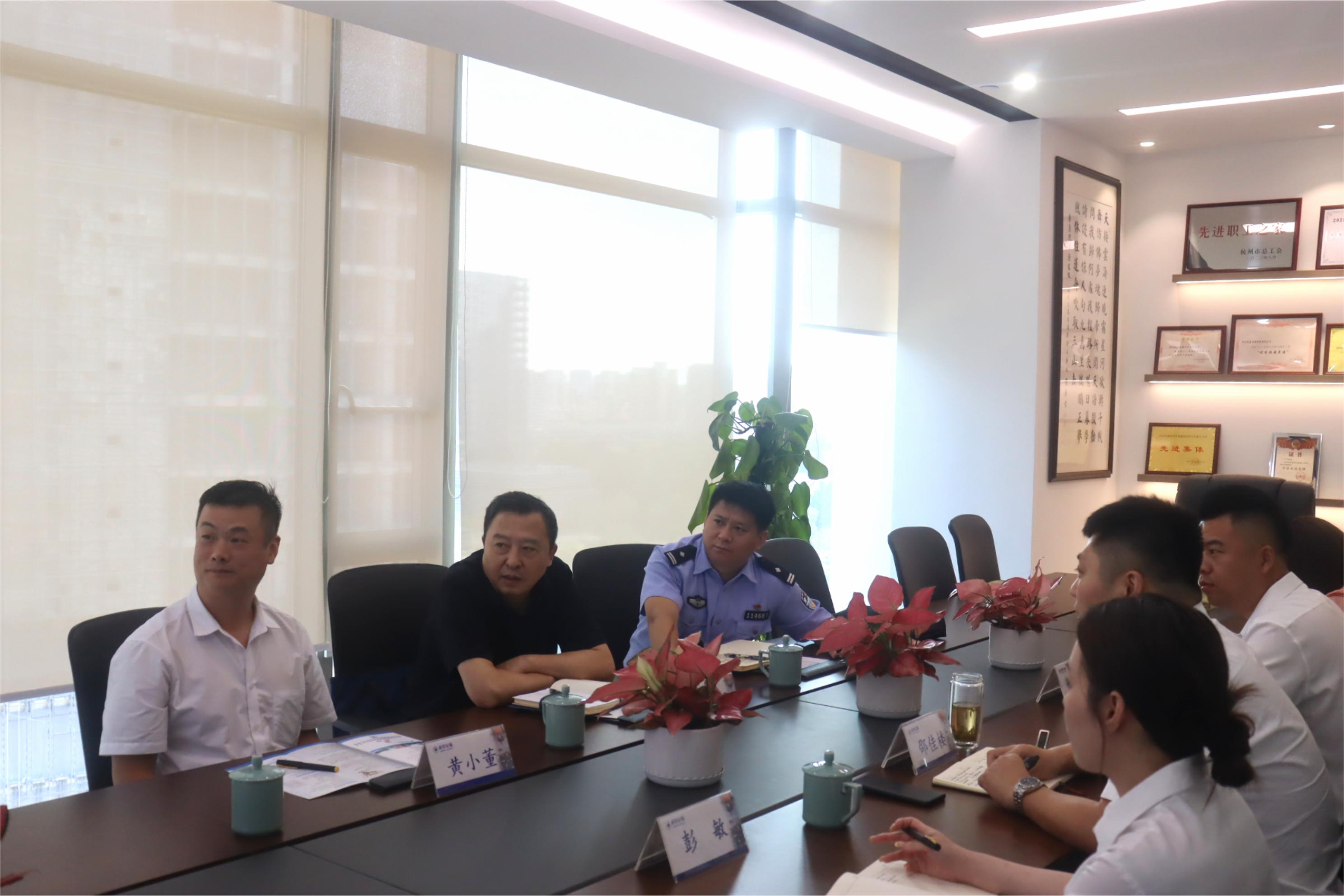 7月23日下午,杭州市公安局基层基础管理支队协警保安监管大队教导员刘崇威、杭州市保安协会秘书长宗杭联一行,莅临杭泰安保进行调研指导并召开座谈会。公司主要领导邵佳楼、高为为携相关部门负责人陪同调研。