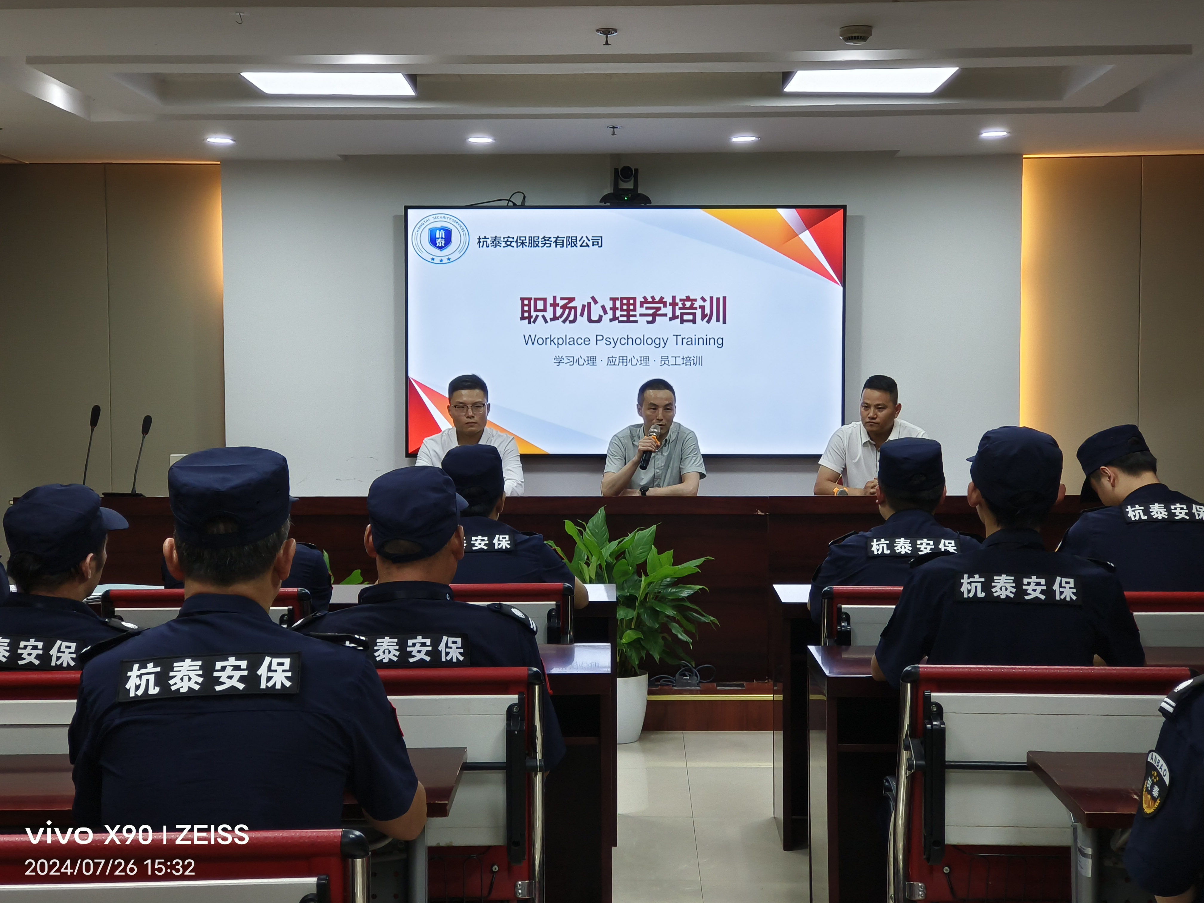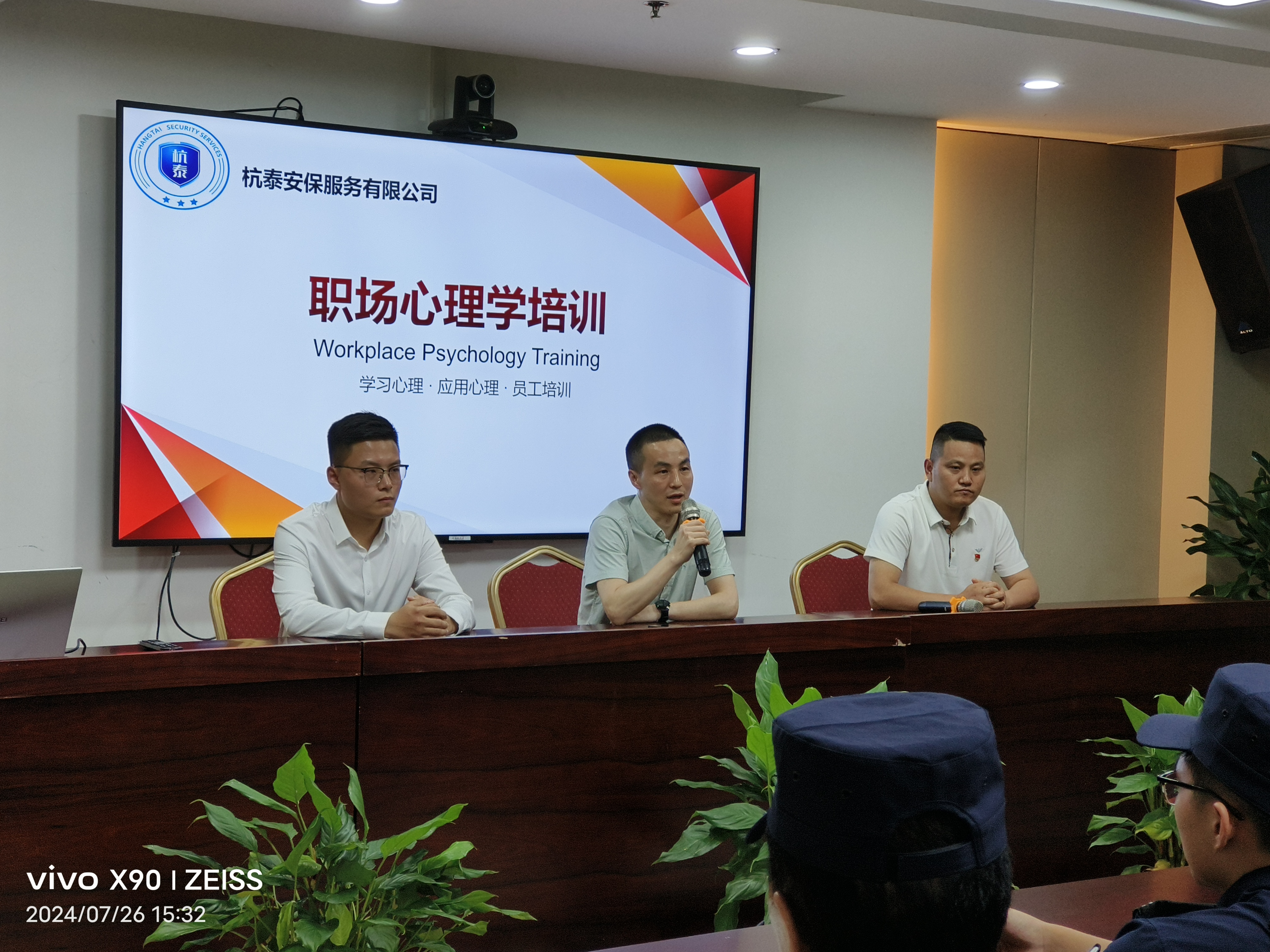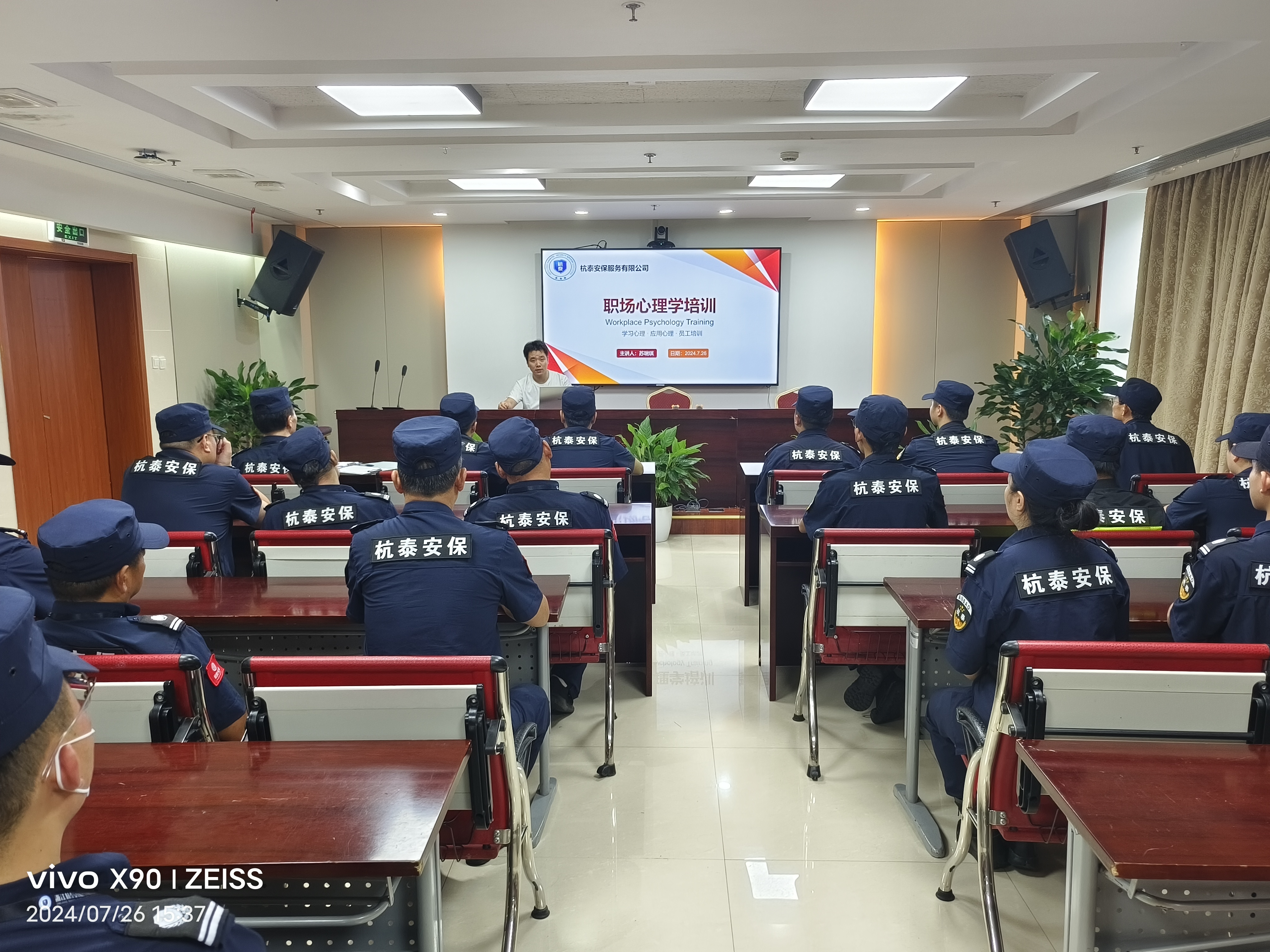 为全面提升杭泰安保驻杭州市第三人民医院保安队的工作能力和服务水平,提高队员的安全责任意识和业务素质,充分发挥出保安队伍在医院安全保障工作中的重要作用,同时做好关心关爱队员心理健康工作,加大对队员的人文关怀和心理疏导,7月26日下午,浙江杭泰安保服务有限公司在杭州市第三人民医院会议室,开展了职场心理学培训和“六员”培训。杭州市第三人民医院保卫部主任戴江榕、浙江杭泰安保服务有限公司直属一大队大队长赵正、杭泰安保驻杭州市第三人民医院项目队长迟善江出席本次培训,30余名队员参加。