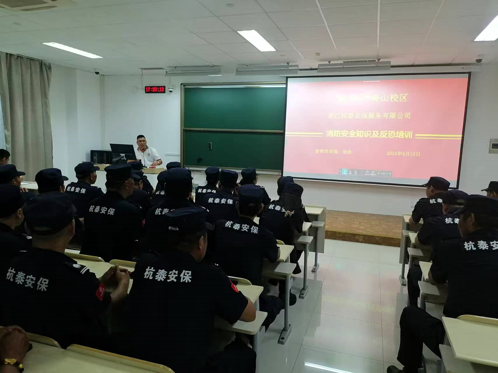 为进一步增强浙江大学舟山校区安保人员的防范意识,安全意识和自救、自护能力,提高校园突发事件应急处置能力,推进消防安全、反恐防暴的制度化、常态化和规范化。2024年8月13日下午5:00,杭泰安保三部经理李志飞特邀请公司督察培训部徐胜老师到浙江大学舟山校区为驻点40名安保队员进行消防安全知识及反恐培训,此次培训为校园的安全筑起了双层防护墙。