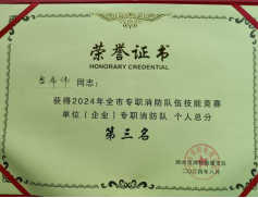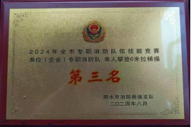 此次比武竞赛,坚持“注重基础、贴近实战”的原则,设置理论测试、3000米、两人五盘水带连接出水操、双人攀登6米拉梯操、单干线出三支水枪操、自建房内攻灭火救人操、十五米金属拉梯操七个科目。在激烈的比赛角逐中,浙江德全丽水项目消防队展现出顽强拼搏的斗志和应有的技能,荣获“2024年全市专职消防队伍技能竞赛单位(企业)专职消防队单人攀登6米拉梯操”第三名,其中参赛队员雷希伟获得“2024年全市专职消防队伍技能竞赛单位(企业)专职消防队个人总分”第三名的好成绩。