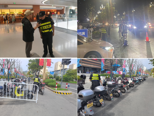 在交通疏导方面,安保小组人员积极协助游客进行路线指引,同时,为维护万达广场周边交通的畅通、安全与有序,安保人员认真将停放不规范的电动车摆放整齐。