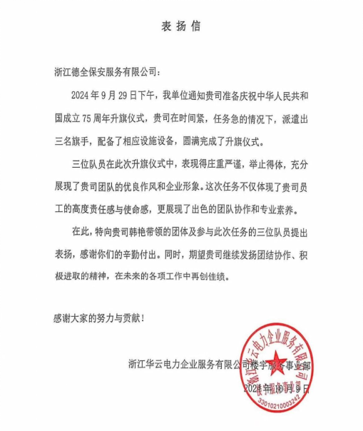他们所展现出的专业素养与敬业精神,赢得了甲方的高度认可与赞誉,并荣幸地获得了正式的表扬信,对其在庆祝中华人民共和国成立75周年升旗仪式中的杰出表现表示由衷的感谢和崇高的敬意。