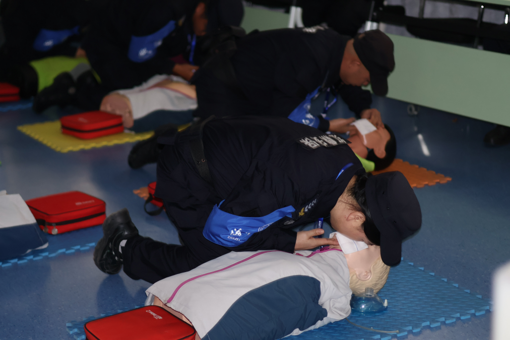 培训期间,安保人员热情专注。讲师讲解时,他们全神贯注,紧盯每一个动作和讲解,仿佛在与时间赛跑争取生命机会。实战演练中,心肺复苏场景开启,他们积极操作,深知动作准确性关乎生命,从判断意识到高质量操作,每个环节都全力以赴,力求标准规范。人工呼吸时同样高度专注,小心把控吹气力度和频率,严谨对待每一步。之后学习电击除颤仪使用方法,通过认真练习能迅速准确判断操作,为患者争取救治时间。