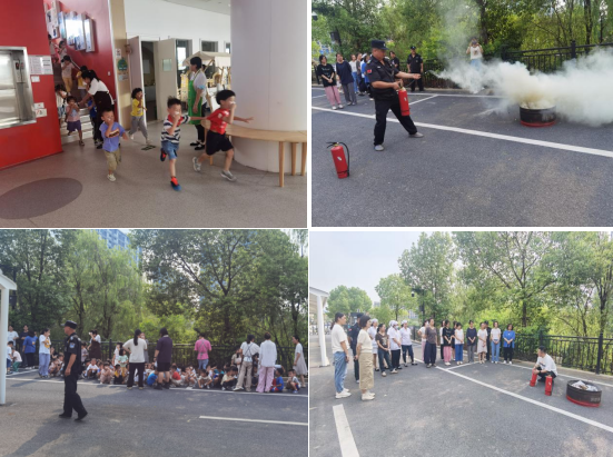 演练开始,模拟校园一角发生火灾。校园老师发现火灾并用对讲机通知消控员,消控员按下火灾自动报警系统,持灭火器赶到火灾现场,观察火势情况,并用对讲机向负责人汇报实地情况,试图用灭火器扑灭火源,与此同时老师组织学生紧急避险。