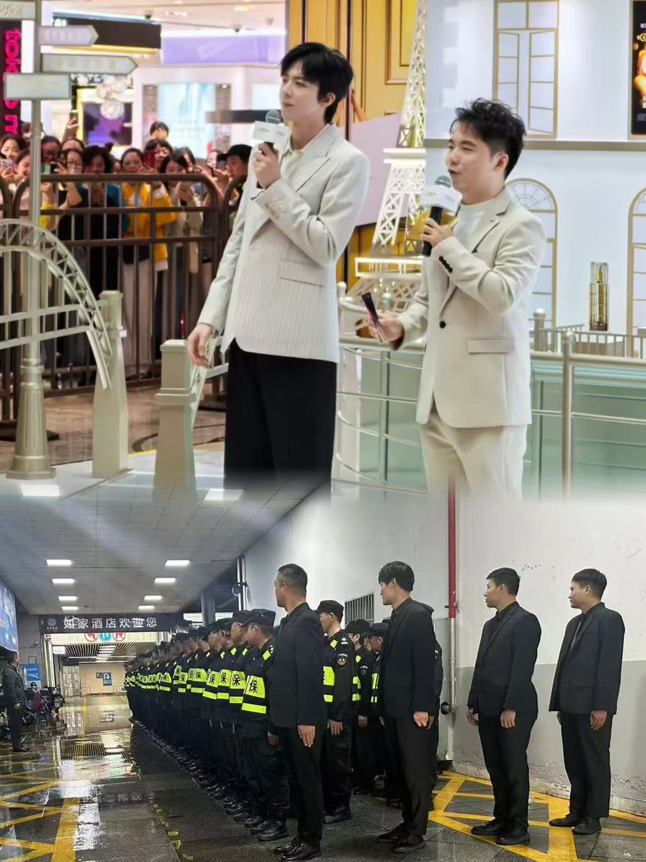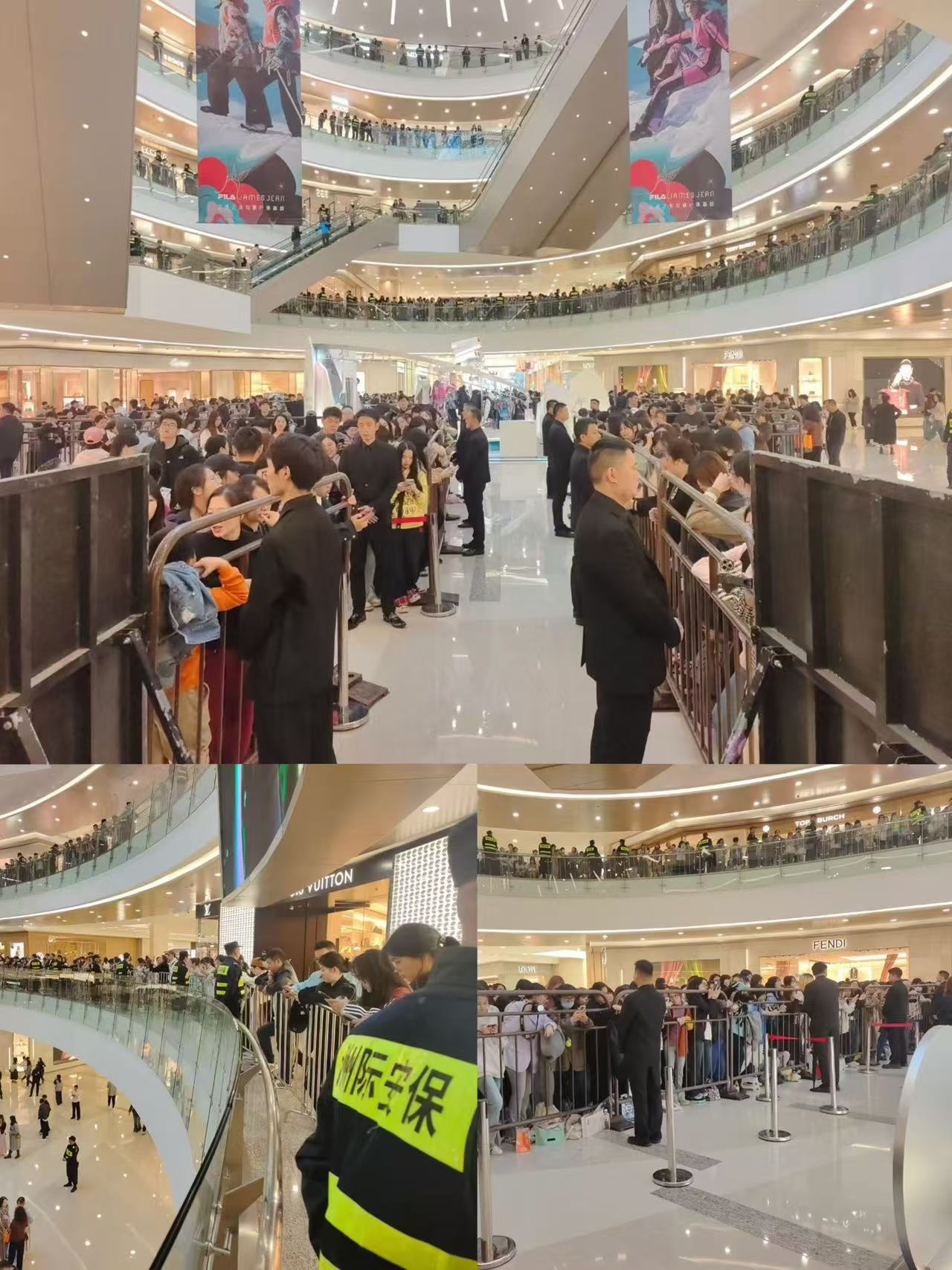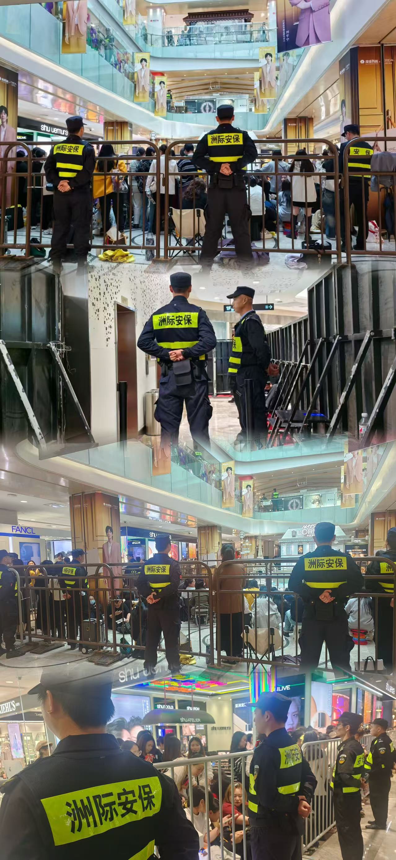 基于活动现场处于商场中庭,艺人粉丝热情高涨等情况。提前对入场安全通道、活动区域、艺人离场路线等重点区域逐一进行仔细勘察,并结合实际情况制定安保工作方案,安保整齐着装,严格落实安保方案要求,做到“定岗、定人、定责”,活动现场,安保人员随时关注着现场人员动态,指引人流有序观看,合理疏导人流,维持现场秩序。