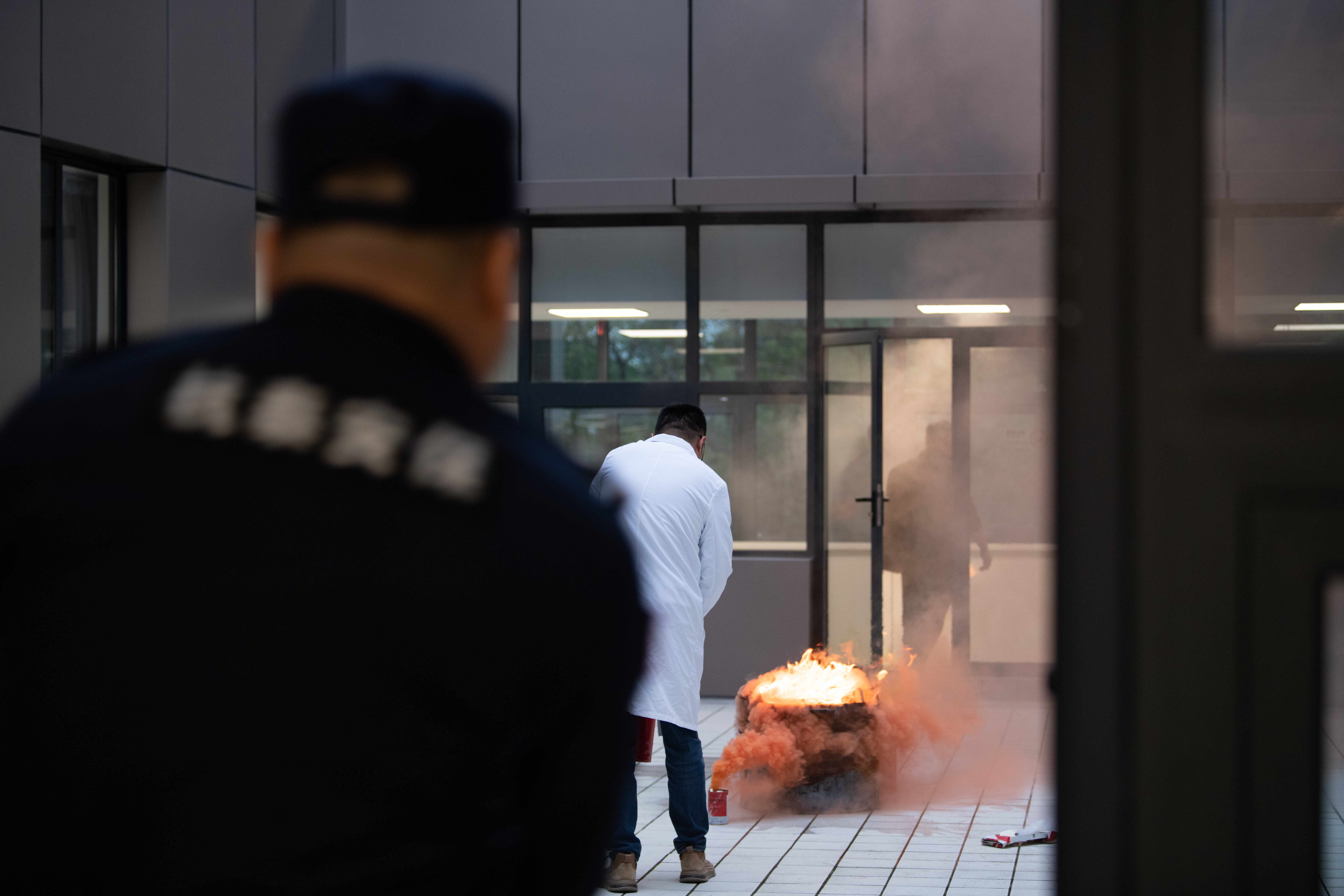 随着急促的警报声响起,消防应急演练正式拉开帷幕。随着演练指令的下达,医院1号楼2楼平台天井模拟有人纵火,烟雾迅速弥漫,警报声此起彼伏。保安队迅速响应,第一时间到达现场,开展火情控制、人员疏散等工作。队员们身着专业防护装备,手持消防器材,迅速而有序地进行火源控制,确保火势不蔓延。同时,其他队员还与医护人员紧密配合,引导患者和家属有序撤离,确保人员安全。