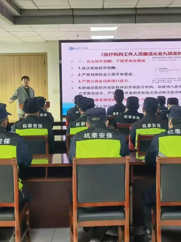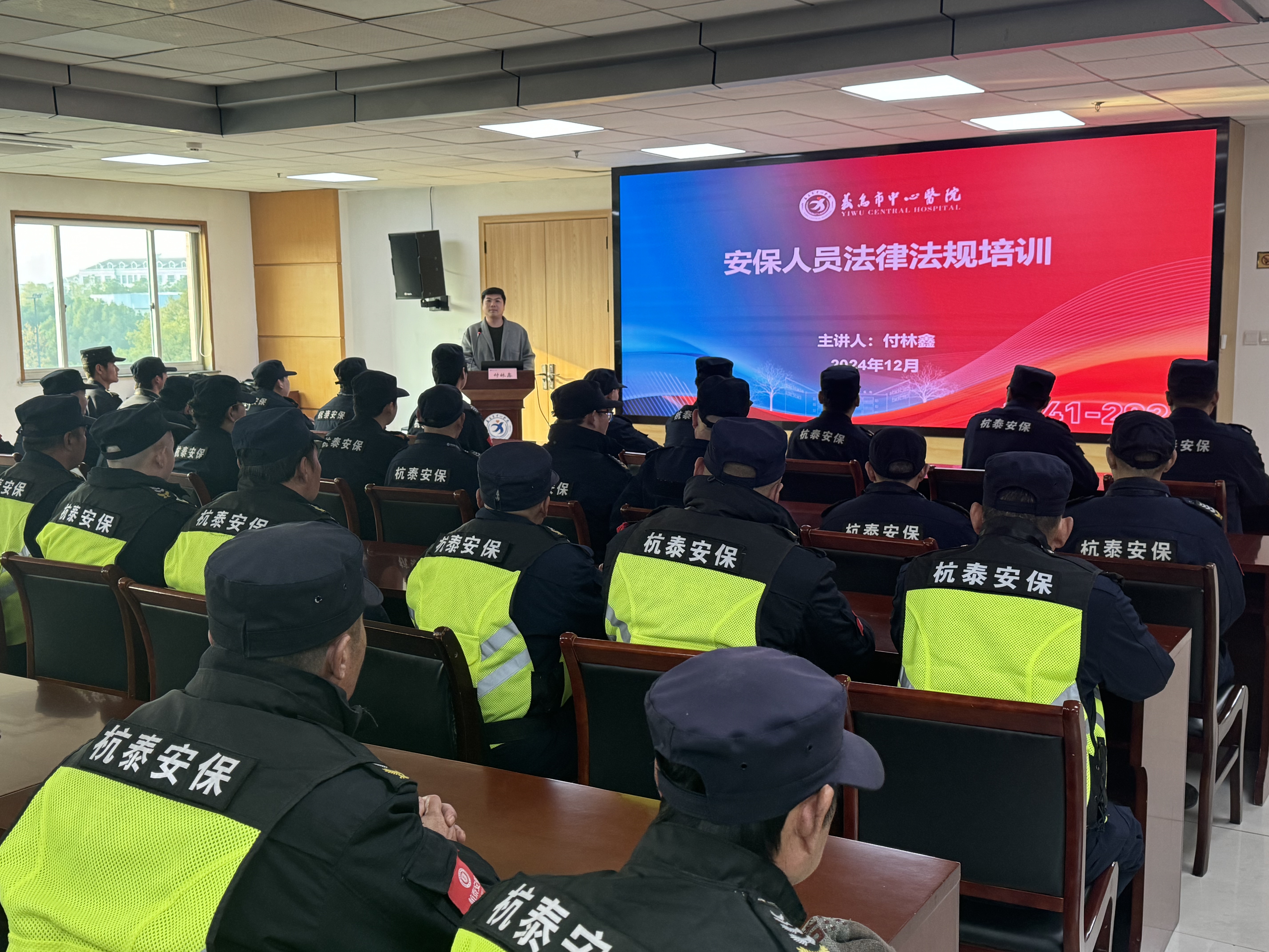为进一步增强义乌市中心医院安保人员的防范意识,法律法规意识,提高医院突发事件应急处置能力,推进医院安全稳定发展。2024年12月26日下午3点30分,浙江杭泰安保服务有限公司特邀请义乌市中心医院纪检监察室主任助理、法务付林鑫为医院82名安保队员进行法律法规培训。