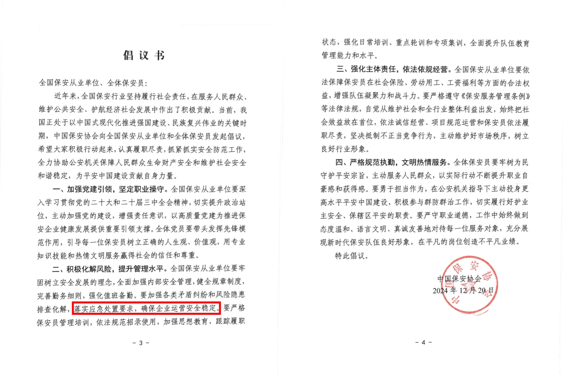 《倡议书》中,中国保安协会深刻阐述了保安员作为社会治安维护的重要力量,在新时代背景下所肩负的光荣使命与责任。协会呼吁全国保安从业单位和保安员要不断提升业务能力和服务水平,积极参与社会治安综合治理,为构建和谐社会贡献力量。