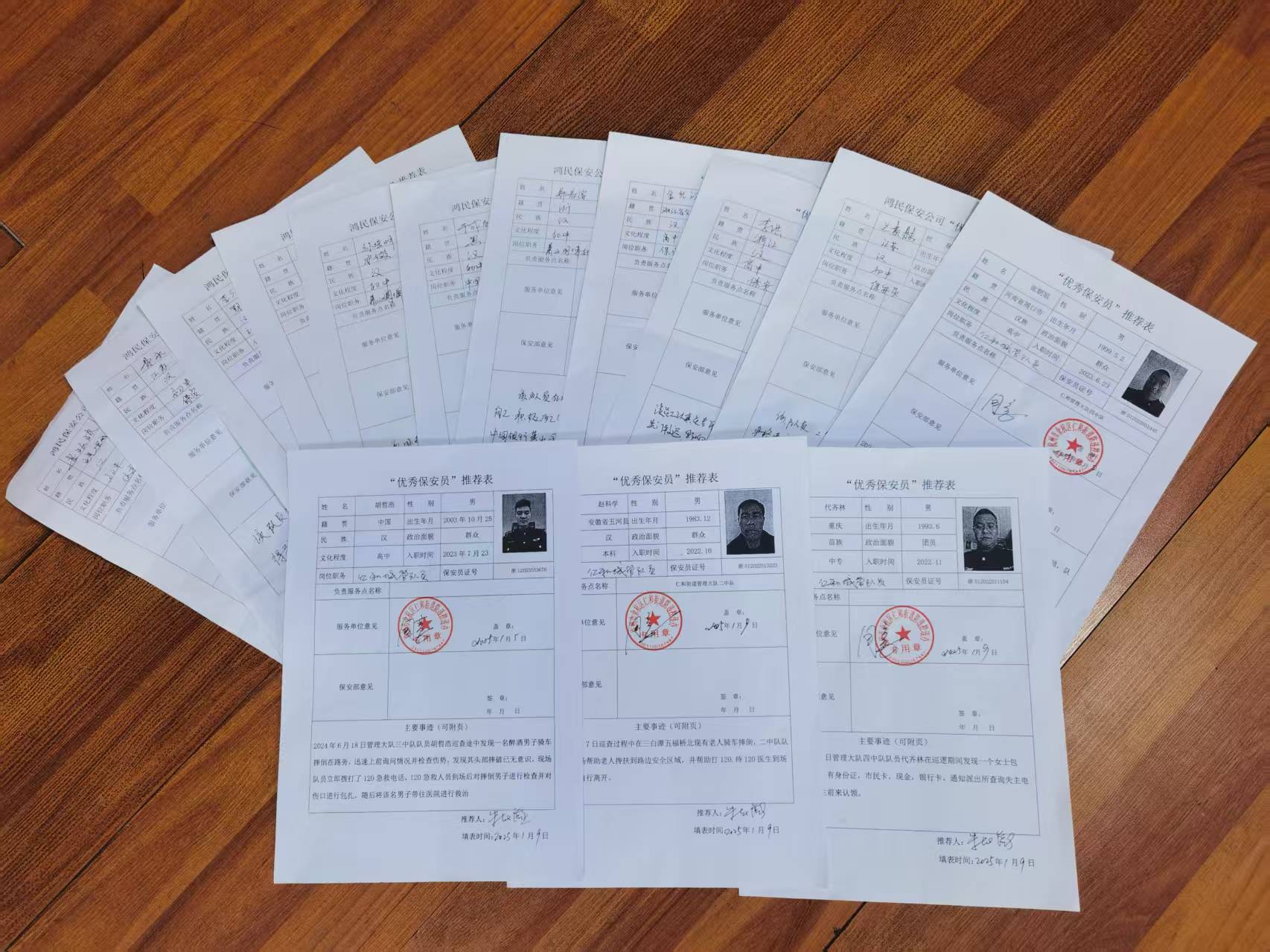 这十八名保安,都有值得学习和肯定的工作成绩。如在中国银行执勤的于成龙,他工作认真负责,礼貌对待每一位客户,被客户赠送了锦旗,获得甲方单位的赞誉;在仁和街道执勤的代齐林拾金不昧,将丢失的钱包归还失主;张朝旭、胡哲浩、赵科学三位同志在仁和街道巡逻期间,遇到突发疾病的行人,及时拨打120,将患者送到医院,获得患者家属及甲方单位的赞赏。