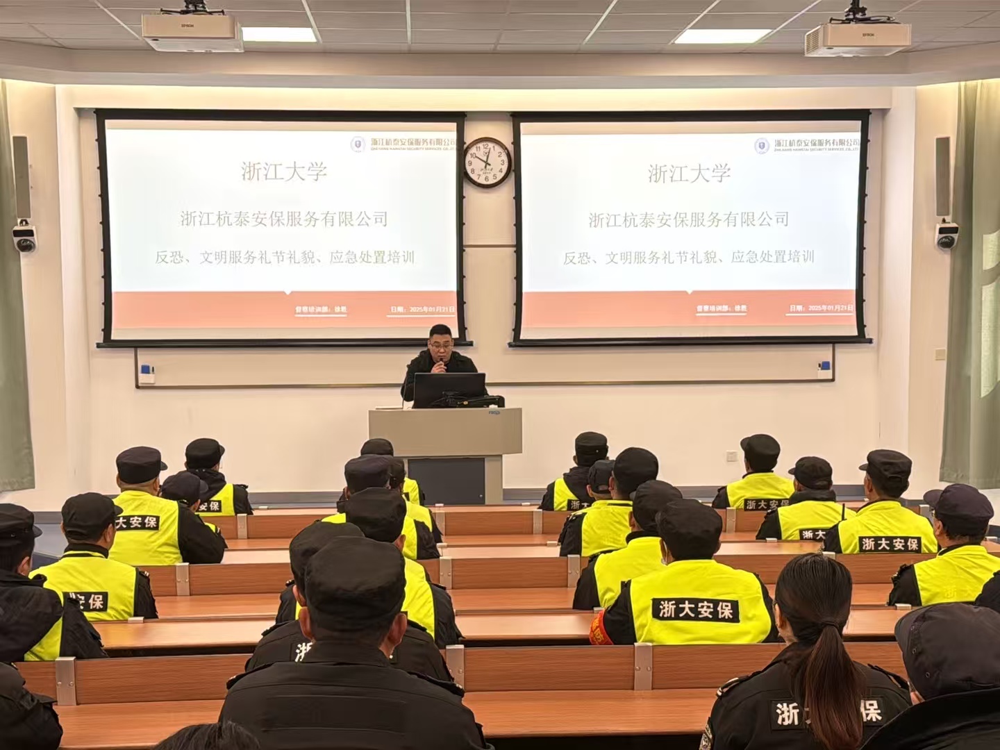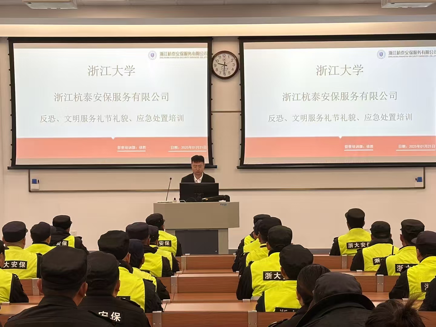 2025年1月21日,为确保“两会”及“春节”期间驻点安全稳定,根据浙江大学华家池、之江校区保卫办统一部署,在校区保卫办以及驻浙江大学华家池校区、之江校区安保中队三方精心组织,杭泰安保保安三部经理李志飞特邀请公司督察培训部徐胜老师为驻点40余名队员进行专项培训。