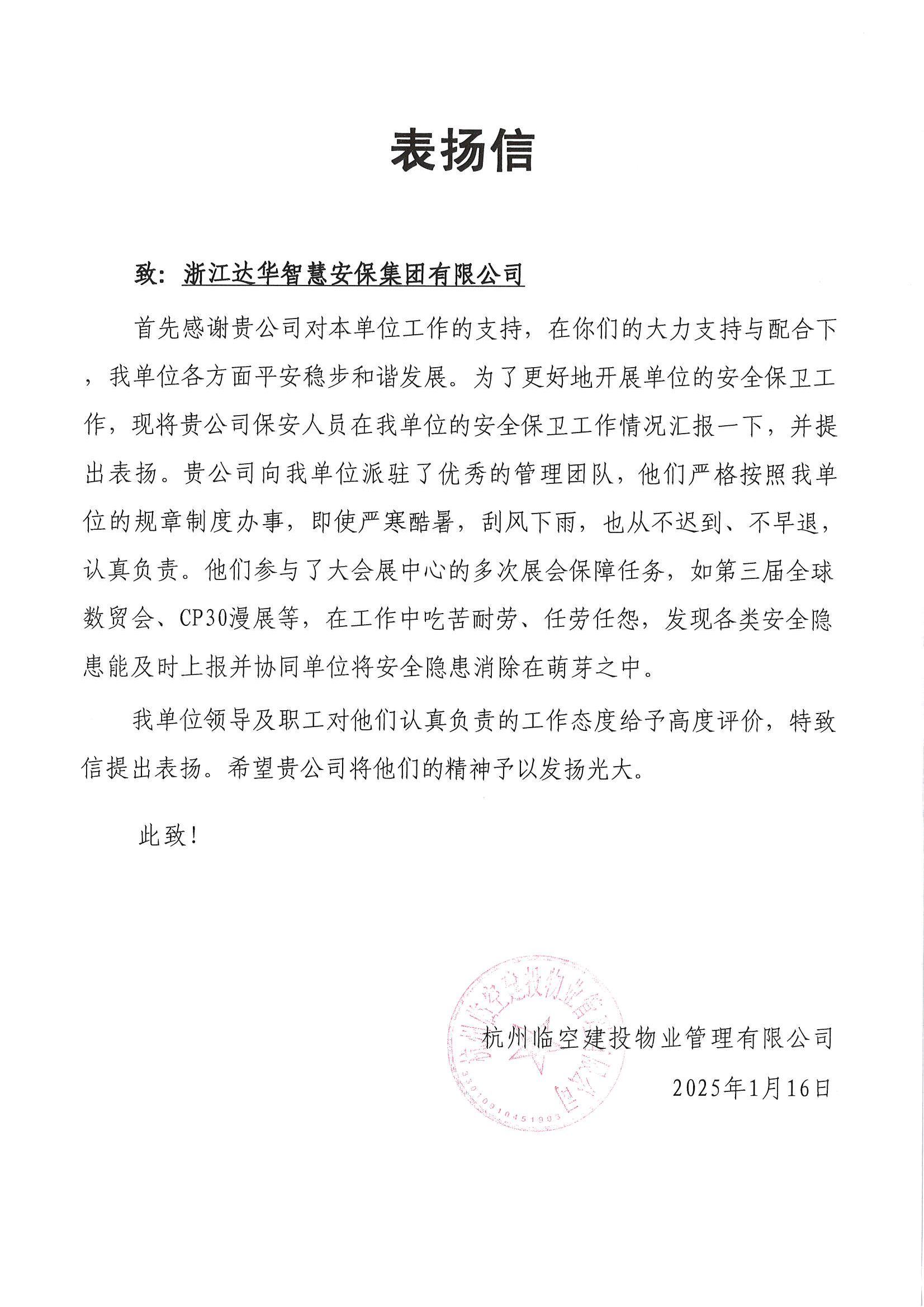 近日,达华智慧安保集团派驻杭州大会展中心安保团队因表现突出、尽职负责,获客户单位杭州临空建投物业管理有限公司发表扬信专题表彰。
