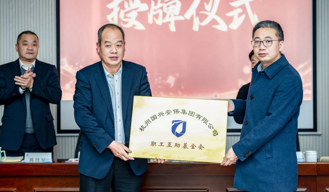 杭州市临安区总工会党组成员、副主席蒋建兵为公司颁发“杭州国兴安保集团有限公司职工互助基金会”牌匾。