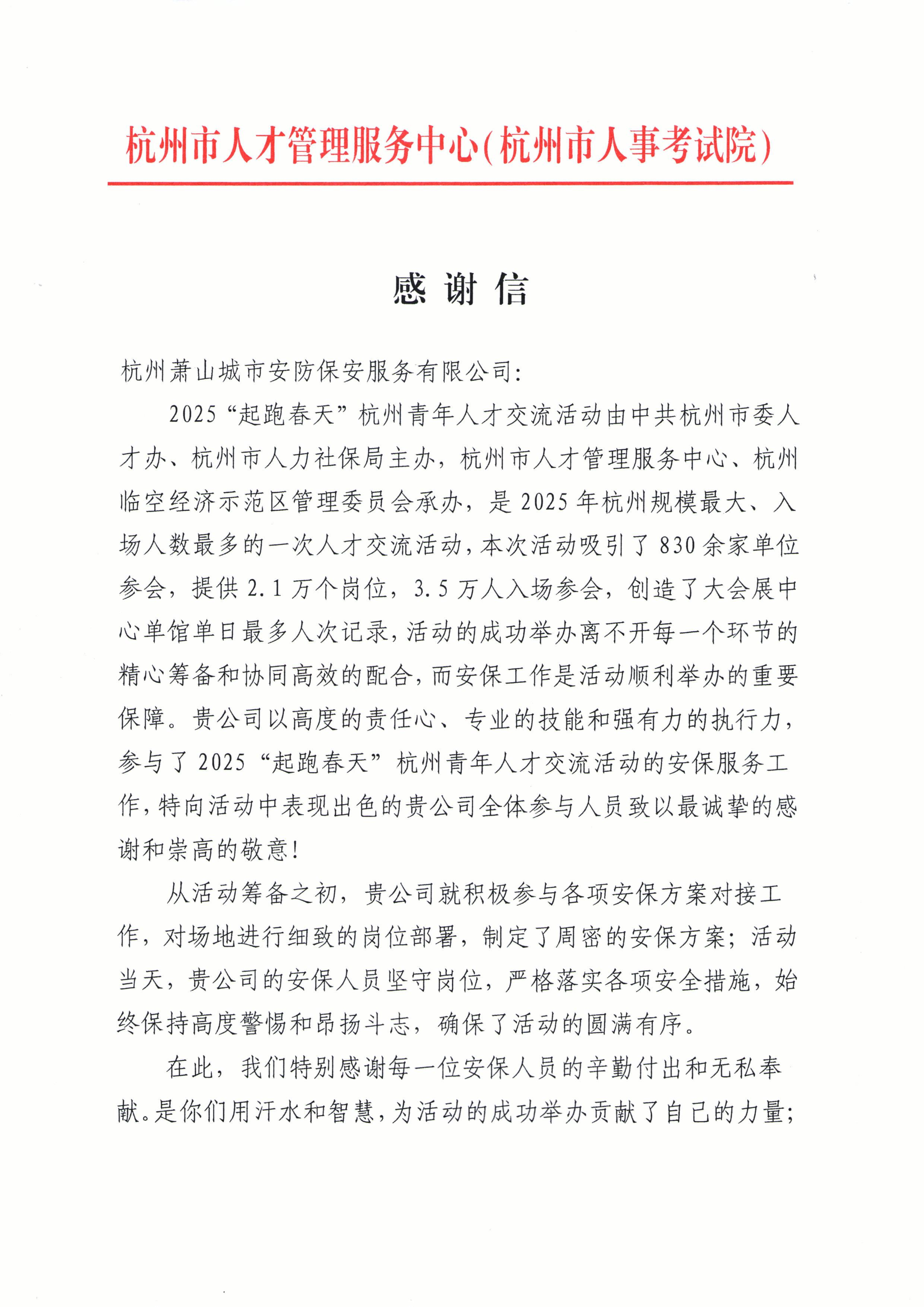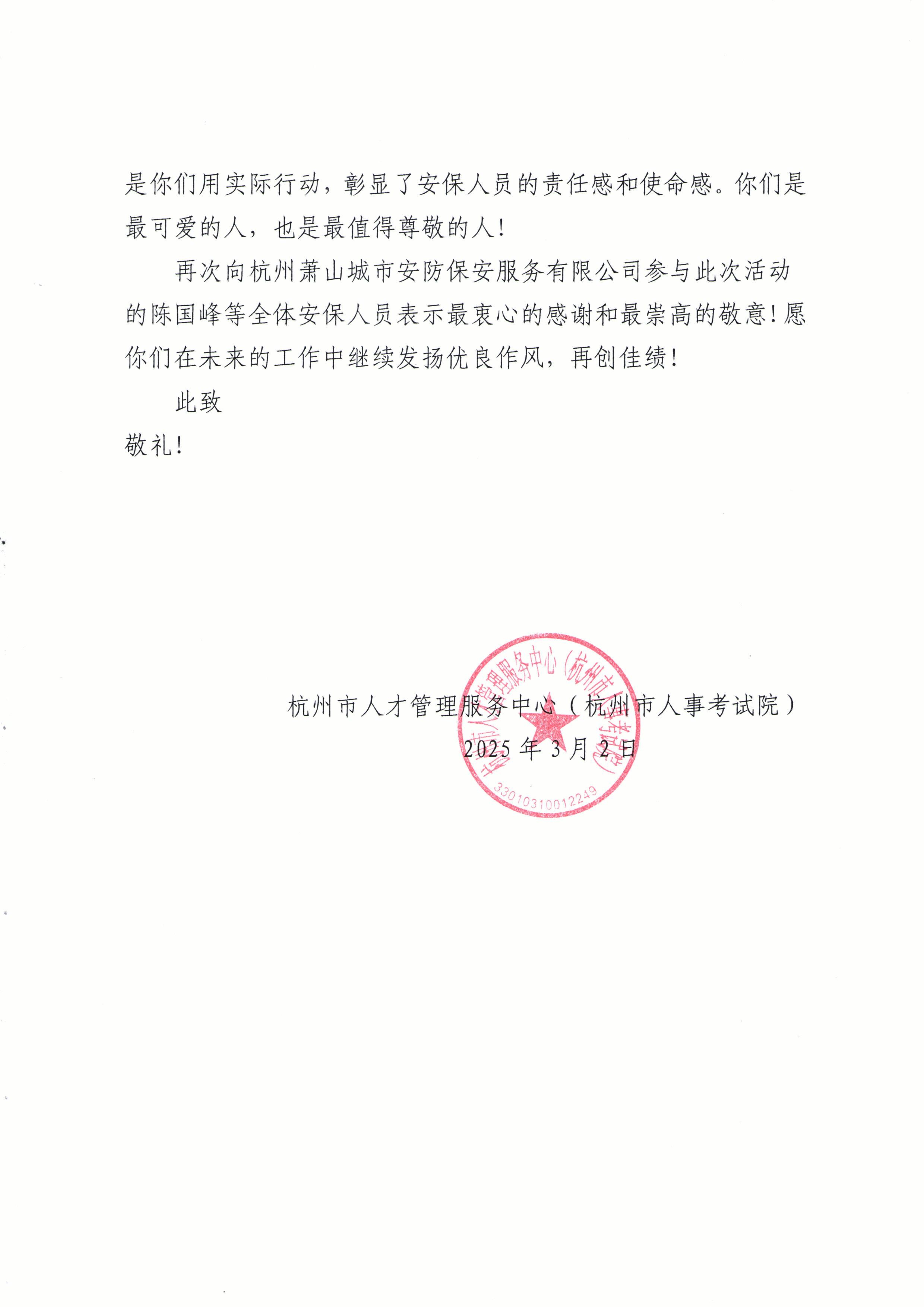 杭州萧山城市安防保安服务有限公司以专业、优质的服务圆满完成本次安保任务,受到甲方的赞许,收表扬信一封。