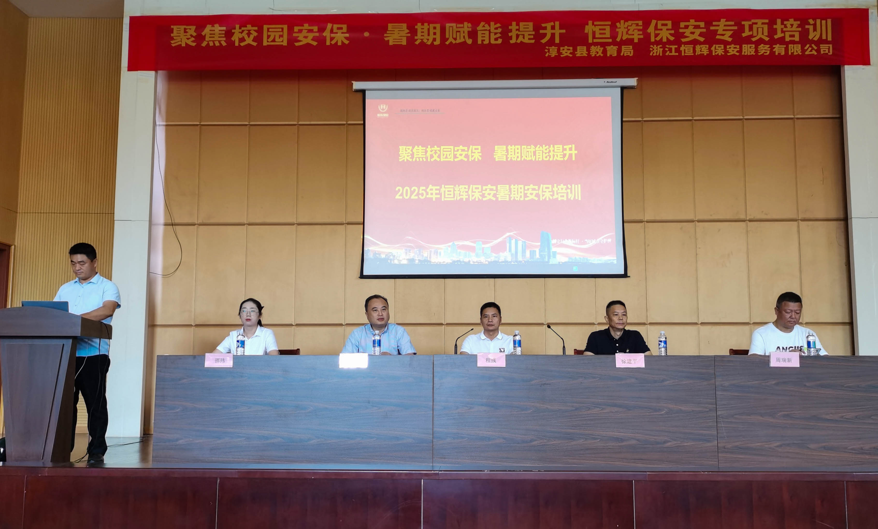 活动首日,举行了开班动员仪式。淳安县教育局安全指导中心程彧,浙江恒邦城市运营服务股份有限公司、浙江恒辉保安服务有限公司董事长徐建平,总经理吴小柱,副总经理周瑞新,综合部主任邵玮参加了开班动员仪式。恒辉保安公司安保部总监吴小伟主持会议。