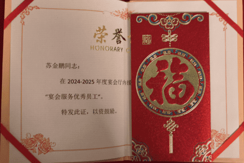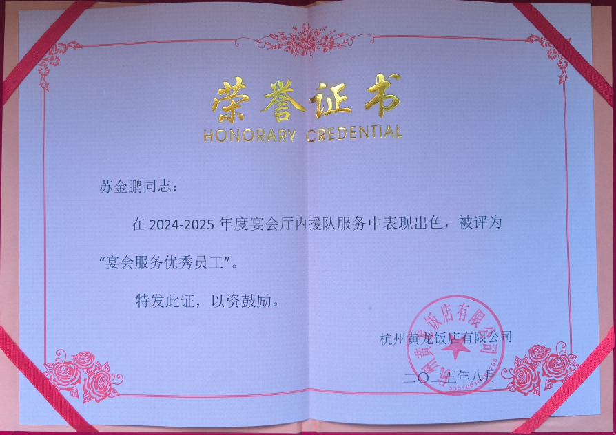 会上特别表彰了3位年度优秀服务人员,其中浙江宇创安保服务有限公司---苏金鹏,凭借出色的工作服务表现,荣获"宴会服务优秀员工",获得荣誉证书及500元现金奖励。