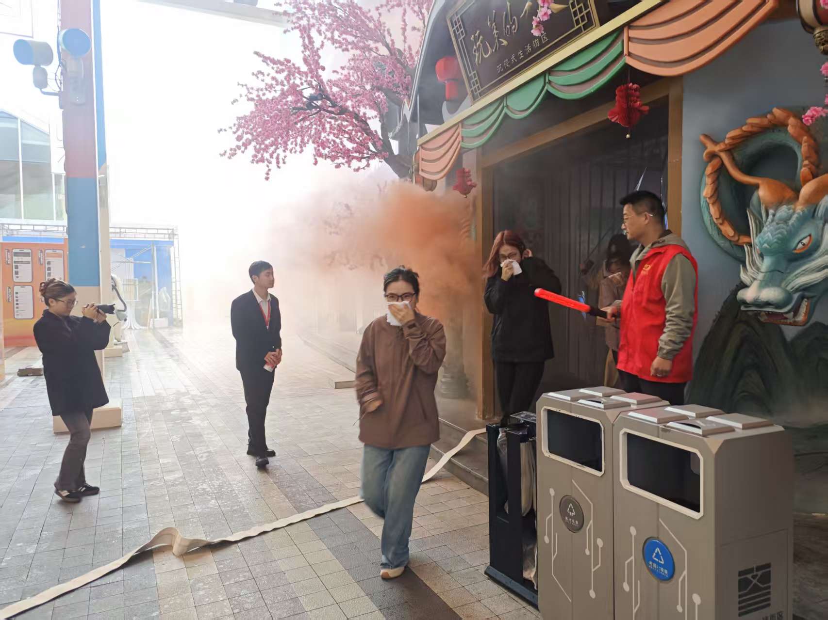 演练现场,实战氛围浓厚。从人员应急疏散逃生演练开始,保安员们按照预设方案,迅速引导“被困人员”弯腰低姿、捂住口鼻,沿安全通道快速有序撤离,整个过程紧张高效、有条不紊,充分展现了应急状态下的组织协调能力。
