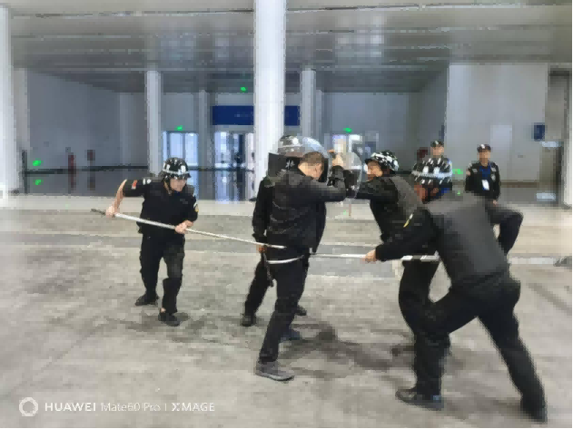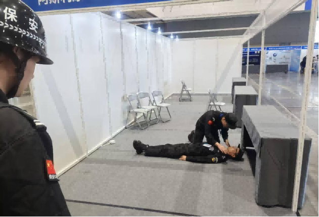 在筹备阶段,确保各项准备工作有序推进,安保部门组织各安检及保安人员提前勘察场地布局,规划人流疏导路线、划分安全管控区域,为确保活动能够顺利进行,安保部门还进行了遇突发状况的演练。演练现场,模拟场景依次展开:当“参会人员” 突发晕厥,就近安保人员第一时间发现并迅速上前,一边轻声安抚、维持周边秩序,一边通过对讲机同步上报指挥小组,联动医疗保障人员携带急救设备快速抵达;面对 “可疑人员试图闯入核心会场” 的模拟场景,入口安保人员保持冷静,严格执行阻拦问询流程,同步呼叫巡逻组支援,快速将人员带至指定区域核查,全程做到规范有礼、处置果断;在火情模拟环节,安保人员迅速启动应急预案,熟练使用灭火器扑灭火源,沿安全通道有序疏散,全程高效有序、忙而不乱。