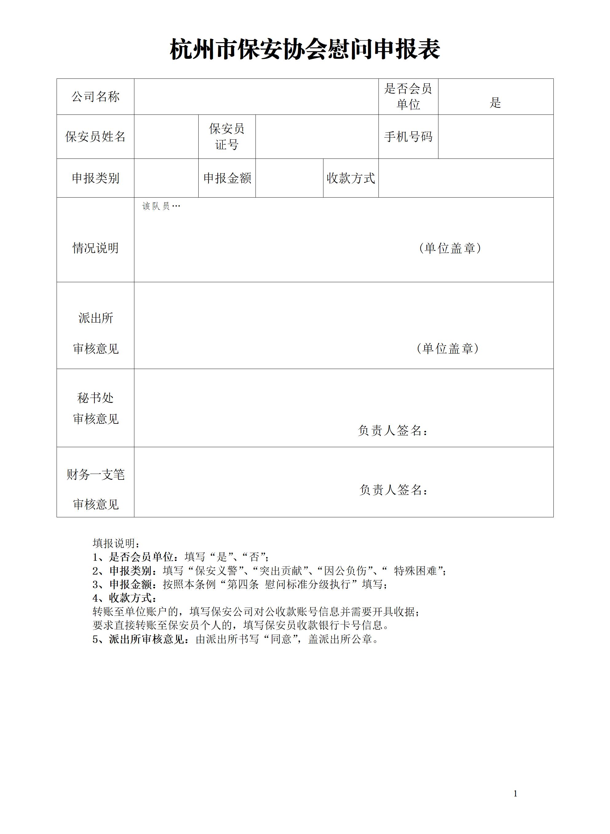 请各会员单位高度重视,认真开展排摸工作,严格按照通知第一点中的限定条件进行申报(每家会员单位上报不超2人,如发现弄虚作假则取消该单位全部人员慰问资格),并填写《杭州市保安协会慰问申报表》(附件)(注:表格中“申报类别”按表格下方填报说明“2”里后三个选项,选择其一填写;“申报金额”无需填写;“收款方式”填写保安员的银行卡号和开户行信息;“情况说明”栏需简述,字数控制在100字以内。表格需打印在一页A4纸上)。