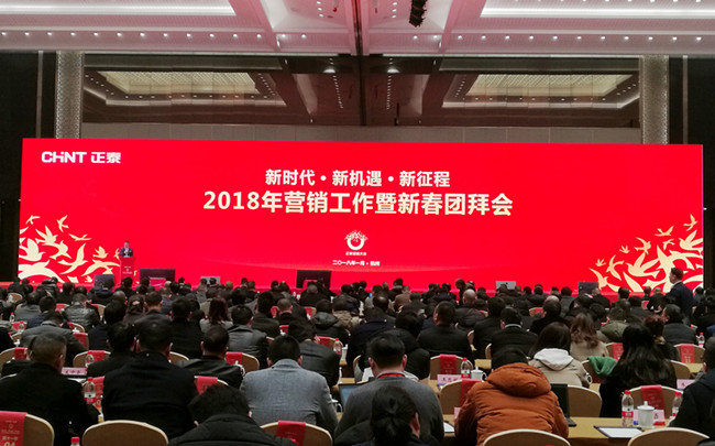2018年1月8日,以“新时代、新机遇、新征途”为主题的正泰“2018年营销工作暨新春团拜会”在杭州国际博览中心隆重举行。来自全国各地的正泰营销精英及集团公司相关部门负责人等600余人欢聚一堂,正泰集团董事长南存辉出席大会并讲话。