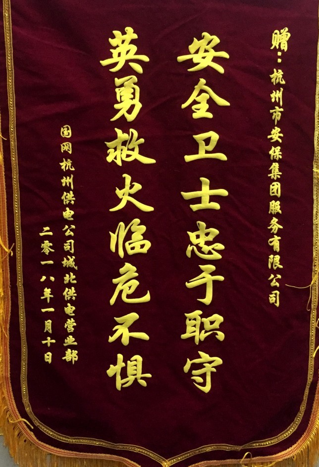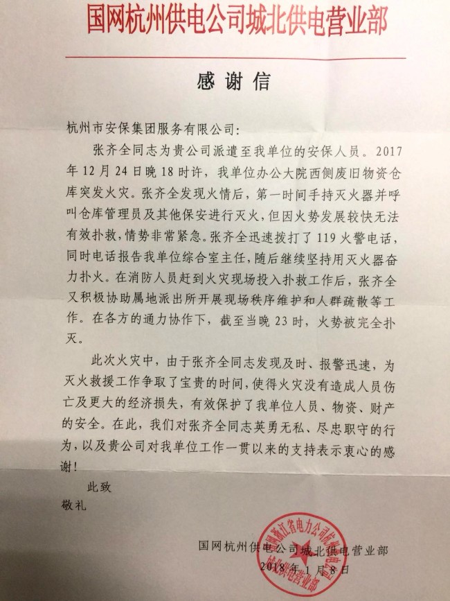 2017年12月24日晚,杭州市安保服务集团有限公司驻国家电网杭州供电公司城北供电营业部安保队员张齐全在执勤时,发现办公大院西侧废旧物质仓库突发火灾,第一时间手持灭火器并呼叫其他保安员及仓库管理员进行灭火。但火势发展较快无法有效扑救,情势非常紧急。张齐全立刻将情况分别上报部门领导及城北供电营业部综合室主任,并迅速拨打119火警电话,随后继续坚持用灭火器奋力灭火。在消防人员赶到火灾现场投入扑救工作同时,公司三部郑经理也紧急从附近执勤点抽调二十几名安保队员,协助属地派出所开展现场秩序维护和人群疏散等工作。截至当晚23时,在各方的通力协作下,火势被完全扑灭。