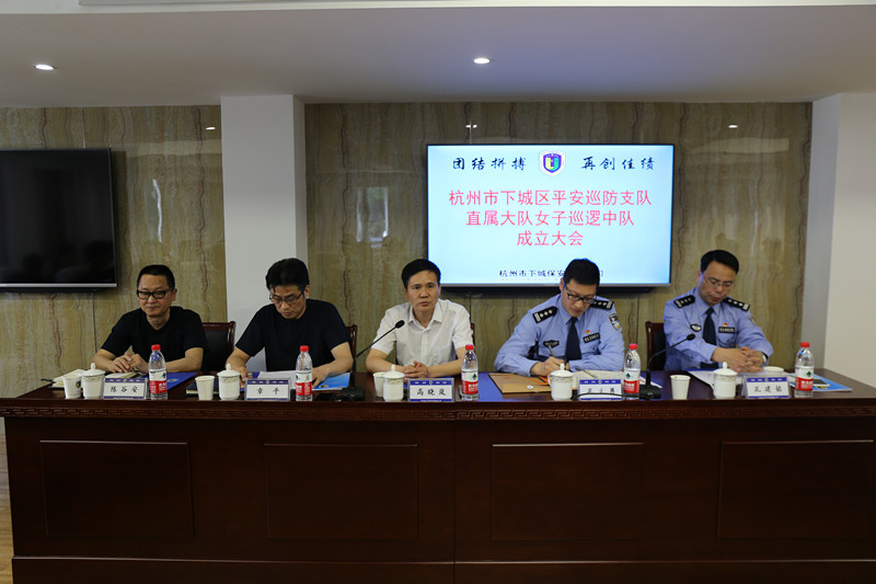 会上,公司汇报了巡逻队的基本情况,巡逻队代表做表态发言,区公安分局党委委员、副局长孔立勇代表公安分局党委对巡逻中队提出要求,并作指导,会议最后,下城区政法委副书记、综治办主任、平安巡防支队支队长高晓岚作重要讲话,并宣布“杭州市下城区平安巡防支队直属大队女子巡逻中队”正式成立。