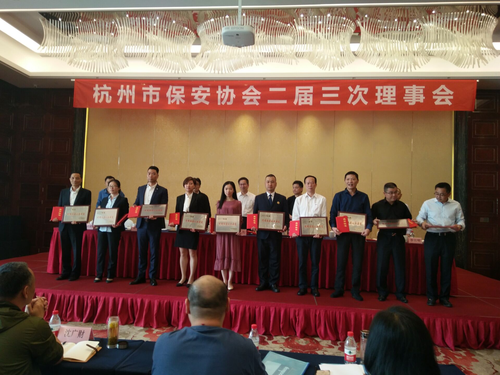 4月27日,杭州市保安协会在杭州瑞立江河汇酒店召开了第二届三次理事会,公司董事长总经理赵南跃参加会议。会上,公司再次被授予“2017年度优秀保安从业单位”荣誉称号,这是公司第三年获得此项荣誉。同时,公司员工林庆华、赵明、罗宇翔被评为“2017年度优秀保安员”。大会向获奖的从业单位及优秀保安员颁发了奖牌和证书。