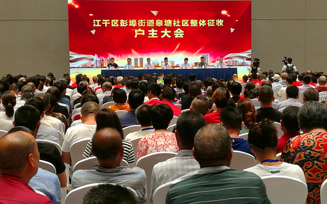 2018年6月26日,江干区彭埠街道皋塘社区整体征收户主大会在杭州国际博览中心三楼会议室召开,江干区彭埠街道皋塘社区各级领导及近千名户主参加了本次大会。
